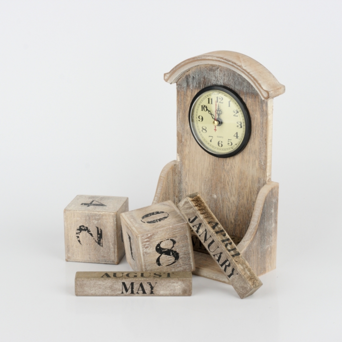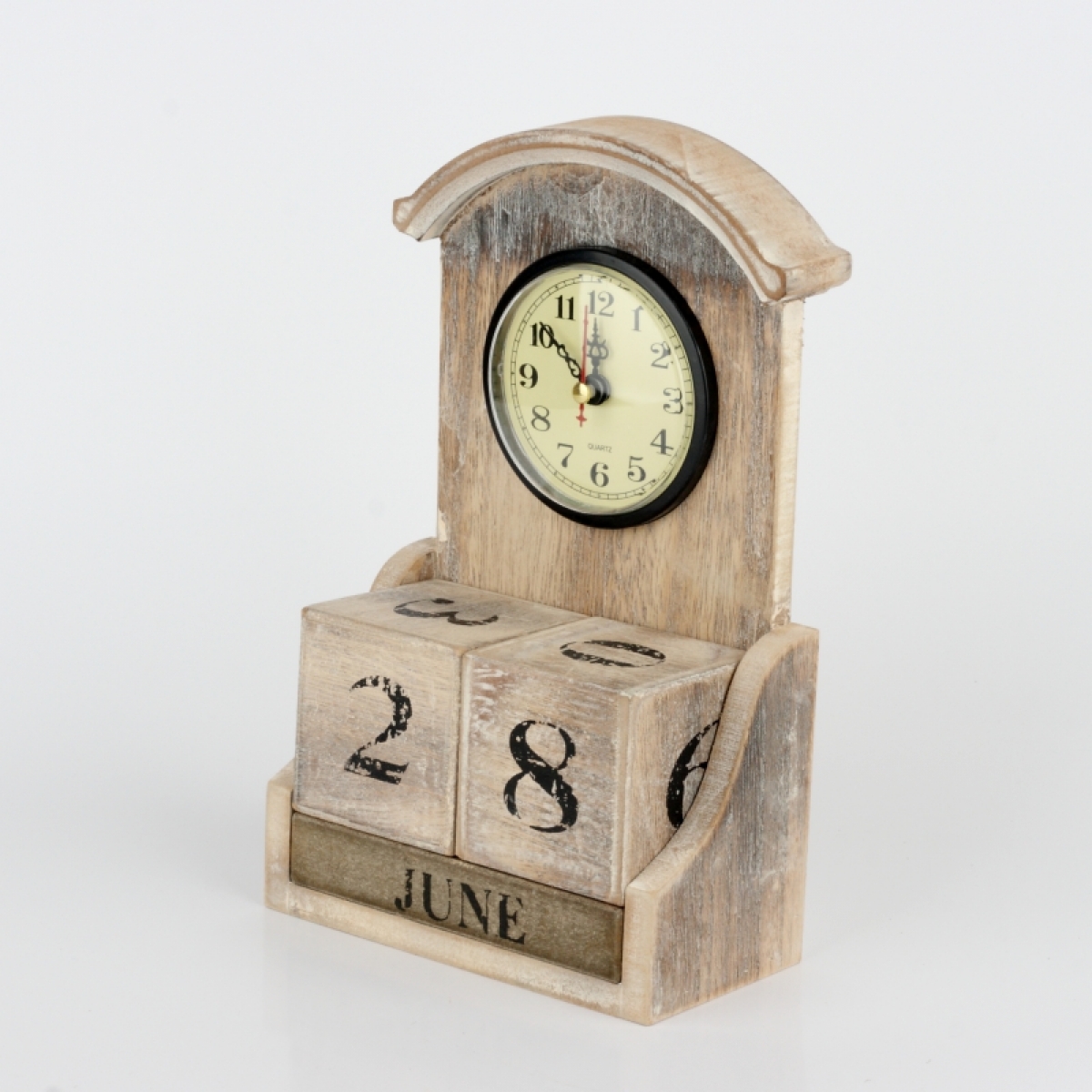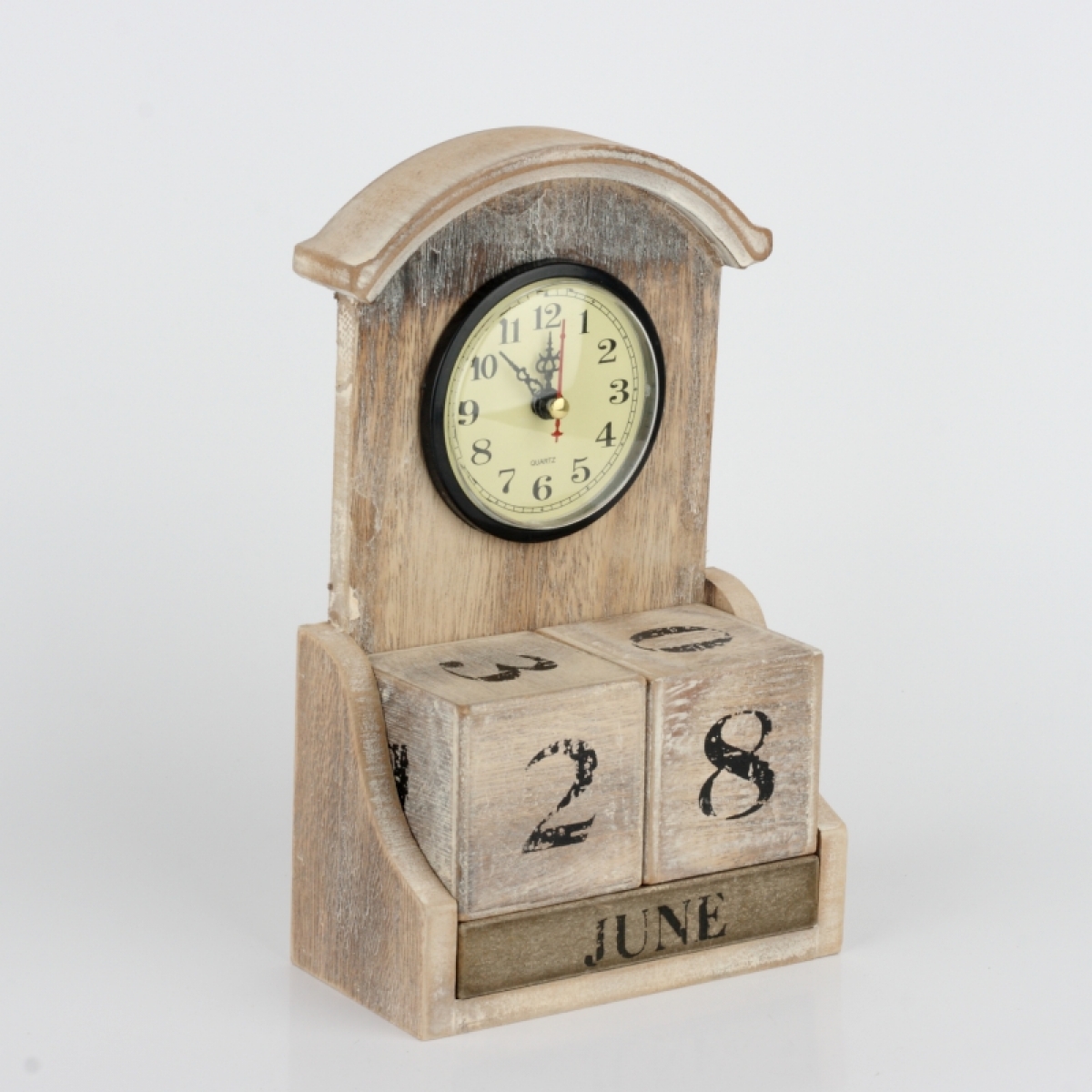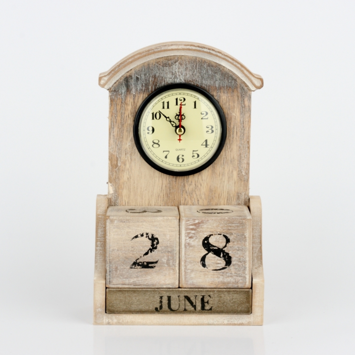 Stolové hodiny s kalendárom prírodnou s patinou 28x14x7cm sú štýlovým retro doplnkom písacieho stola aj komody.