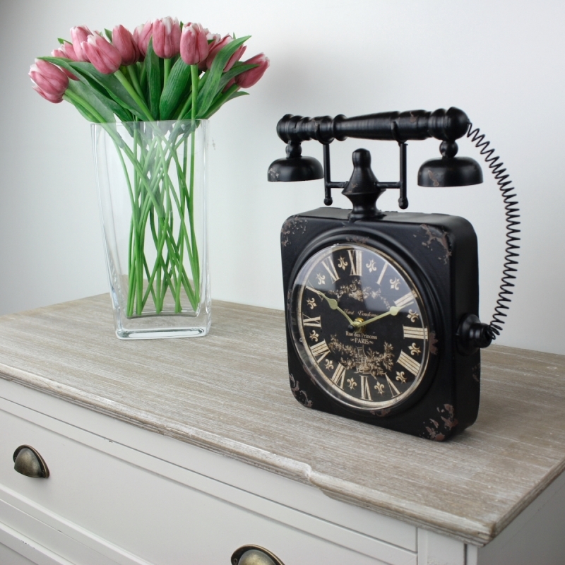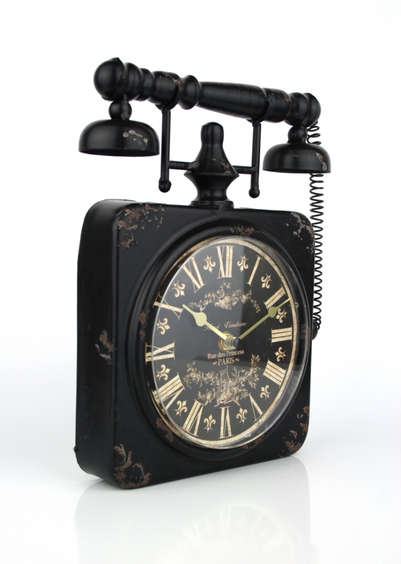 Hodiny sú štýlovým doplnkom do každého interiéru. Podčiarknu jeho štýl a dotvára ducha. Tieto stolové hodiny sú naozaj skvostným kúskom! Pripomínajú starý retro telefón so slúchadlom a šnúrou. Rímske číslice, vintage zdobenie a patina na nás pôsobí, ako by hodiny boli práve nájdené na staré pôde.