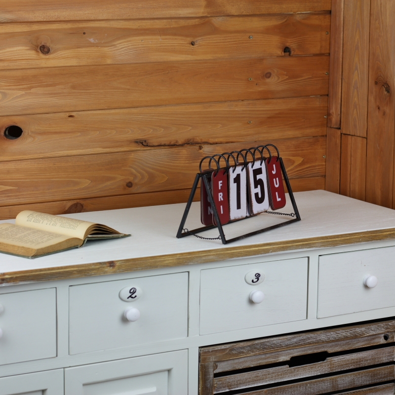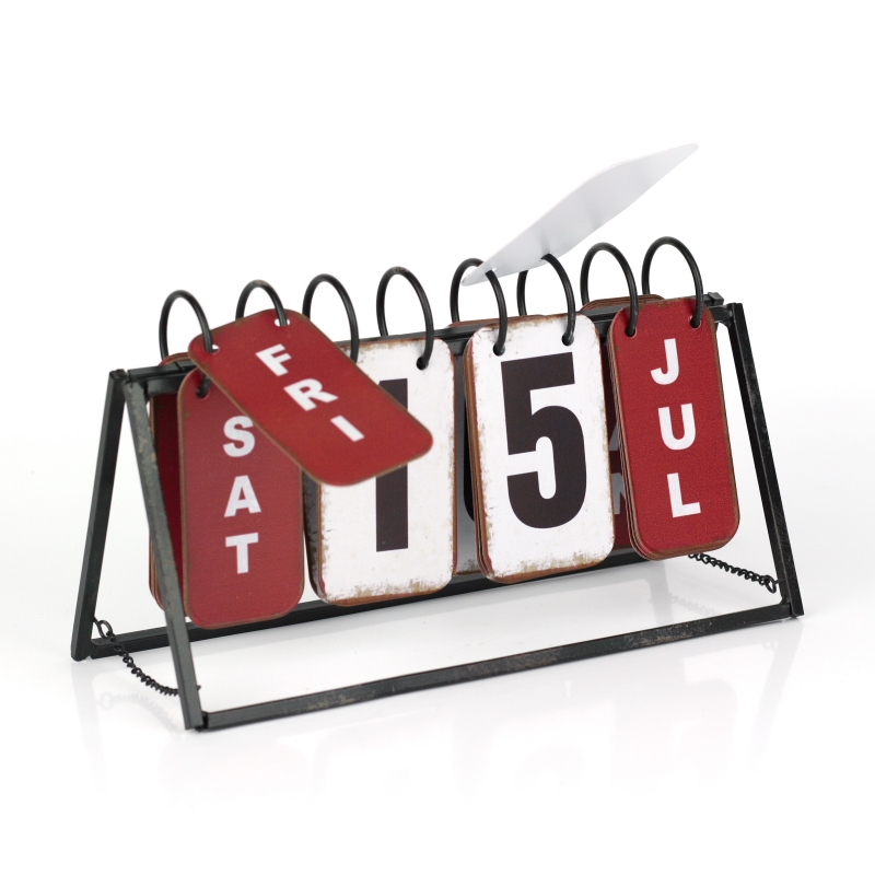 železný kalendář s cedulkami na otáčení. šířka 27cm, hloubka 10,5cm a výška 15cm