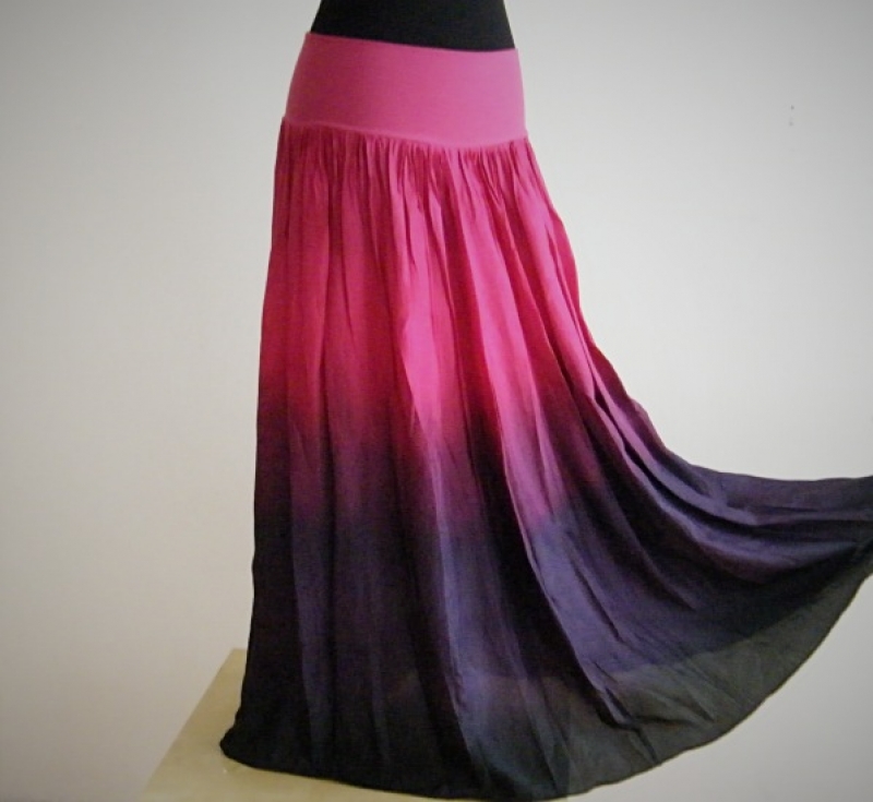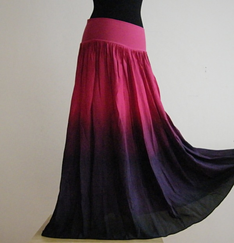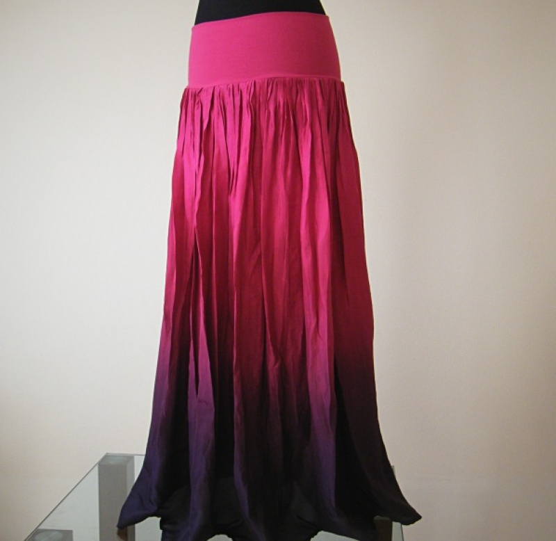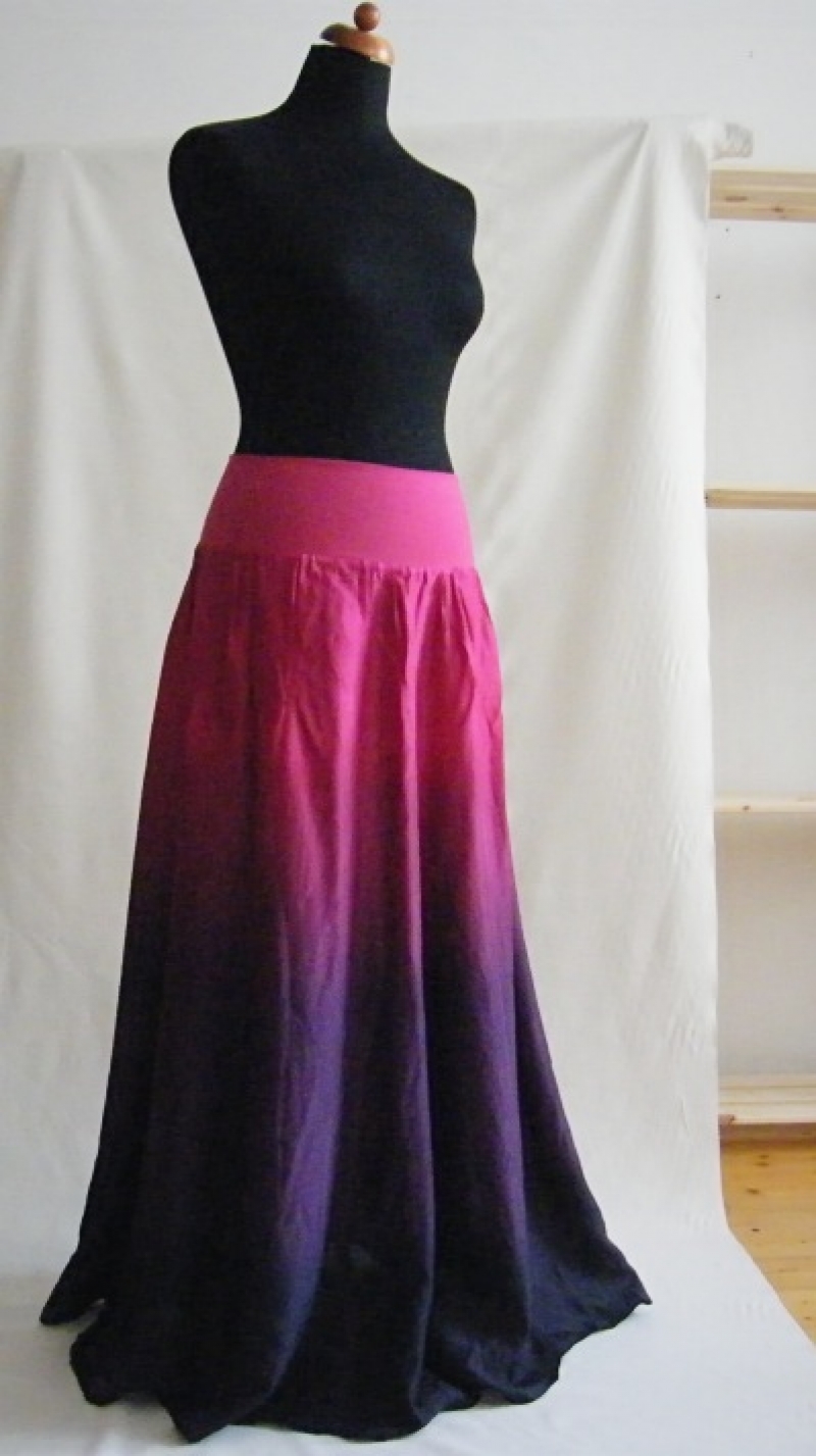 Dlhá hodvábna sukňa bez spodničky rozšižujícího sa strihu, len mierne riasená, dole široká. Je ľahká a vzdušná, ručne farbená nezávadnými profesionálnymi farbami pre parné fixáciu.