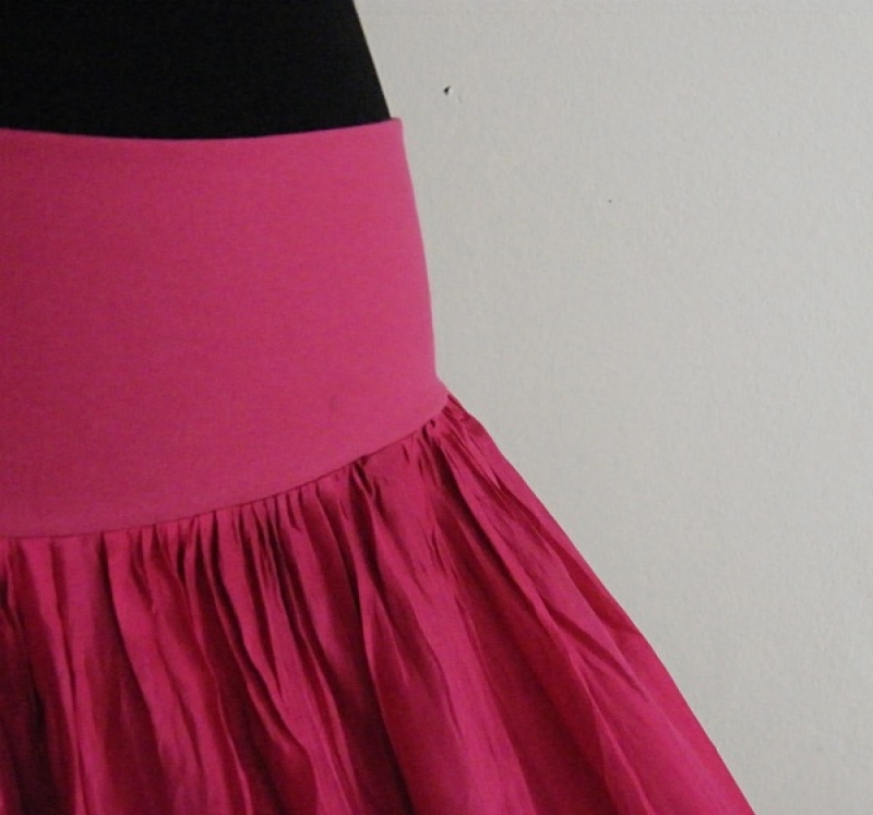 Je všitá do úpletového bavlneného pásku pre pohodlné obliekanie. Šírka pásky je 10-12 cm. Dĺžka sukne cca 100cm.