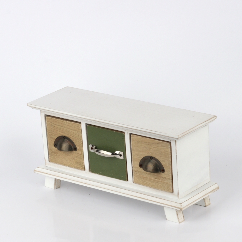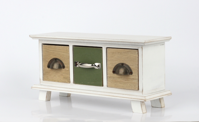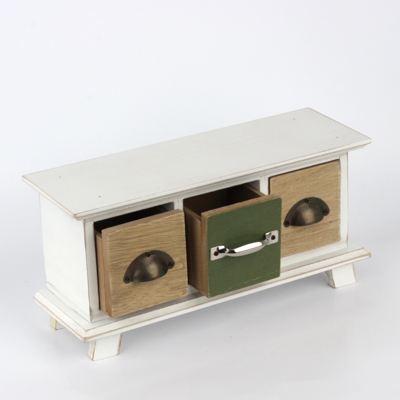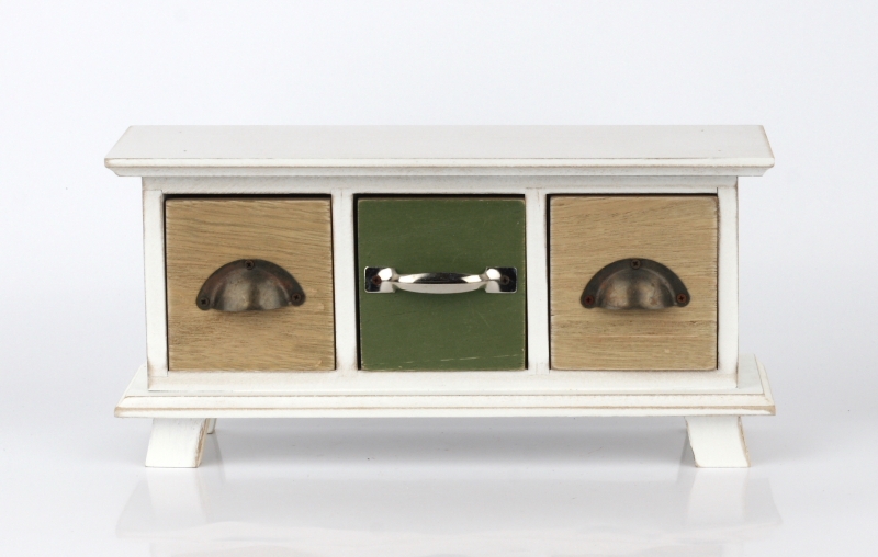 Do troch šuplíčkov môžete ukryť napríklad šperky, sladkosti alebo sáčky na čaj. Drevená skrinka s šuplíky sú zaujímavo oživené dvomi typmi úchytiek.