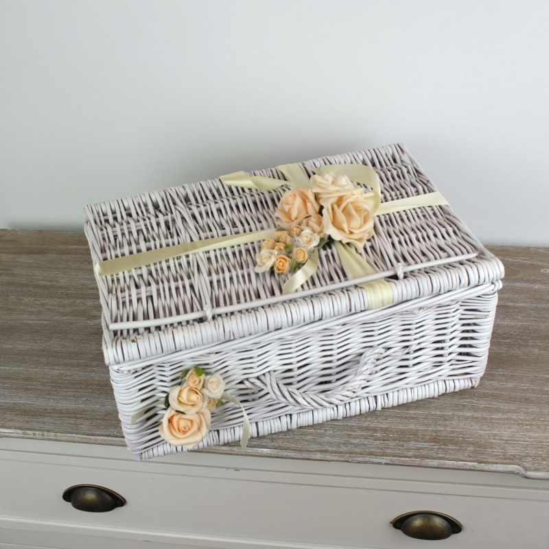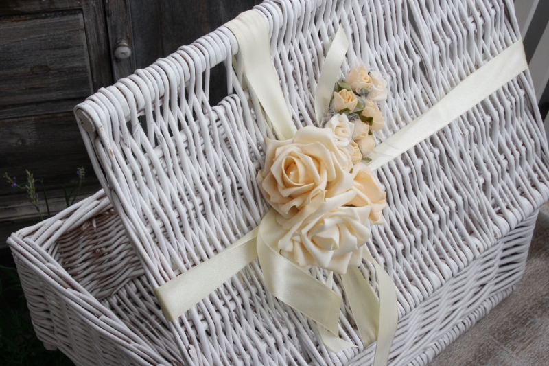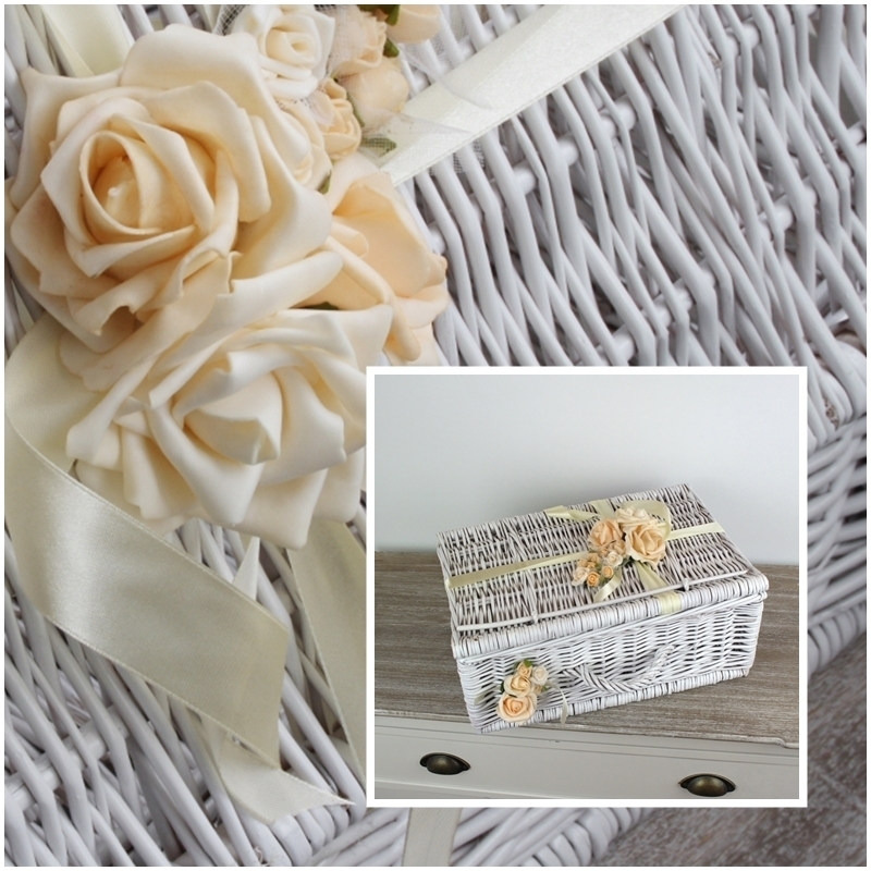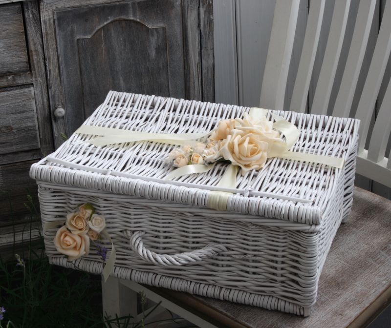 Svatební schránka na přání/ proutěný bílý kufr 40x17x28cm Koupili jste novomanželům pár drobností do nového bydlení? Nevíte si rady, jak dárek pěkně zabalit? Využijte krásný proutěný kufřík, do kterého můžete vložit cokolic, co chcete novomanželům předat.