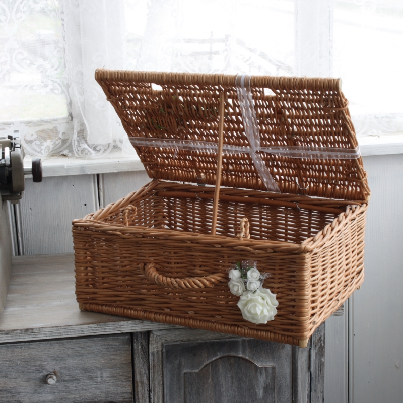 Svatební schránka na přání/ proutěný kufr 40x17x28cm Koupili jste novomanželům pár drobností do nového bydlení? Nevíte si rady, jak dárek pěkně zabalit? Využijte krásný proutěný kufřík, do kterého můžete vložit cokolic, co chcete novomanželům předat.