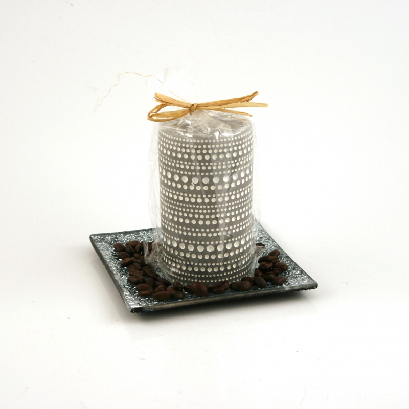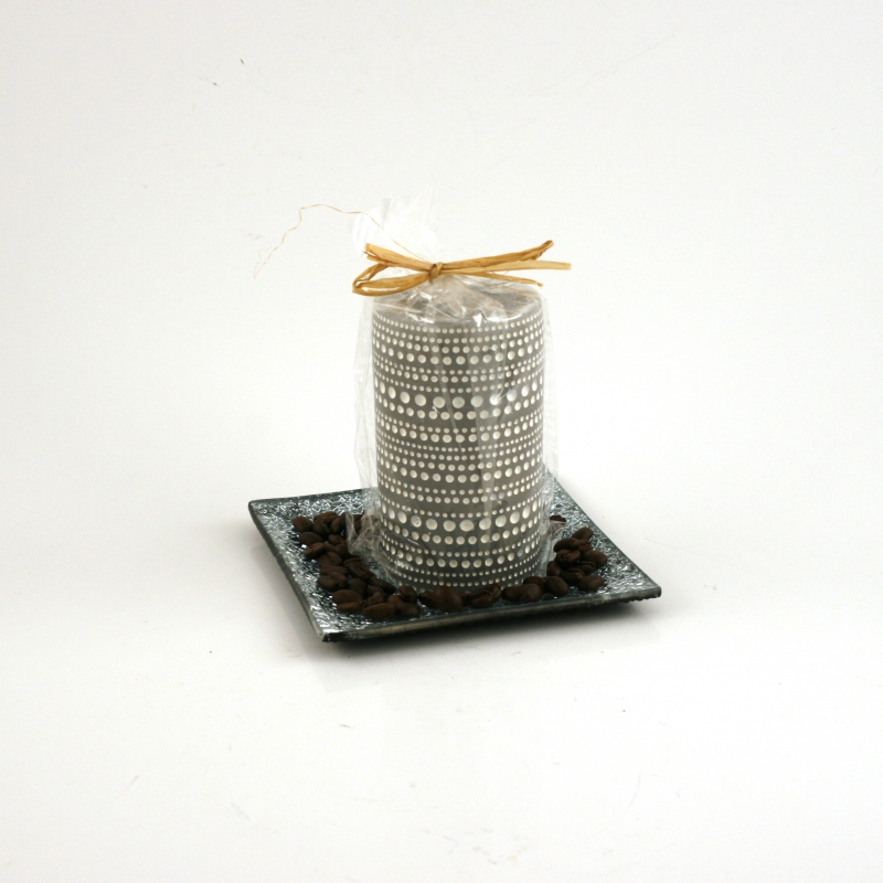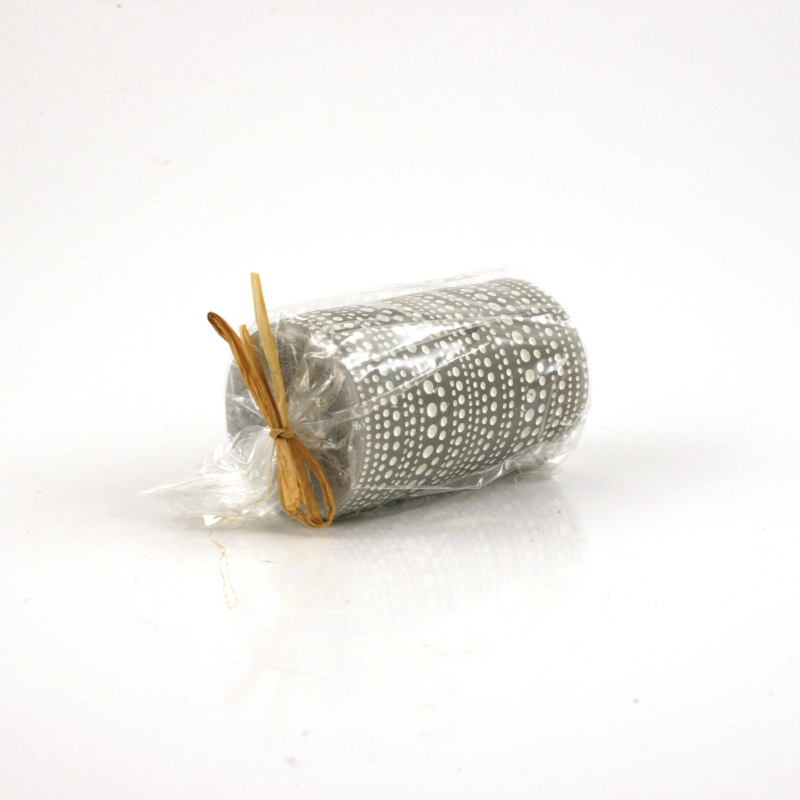 Sviečka na obrázku má priemer 7cm a je vysoká 10cm . Jej povrch je zdobený rôzne veľkými bodkami .