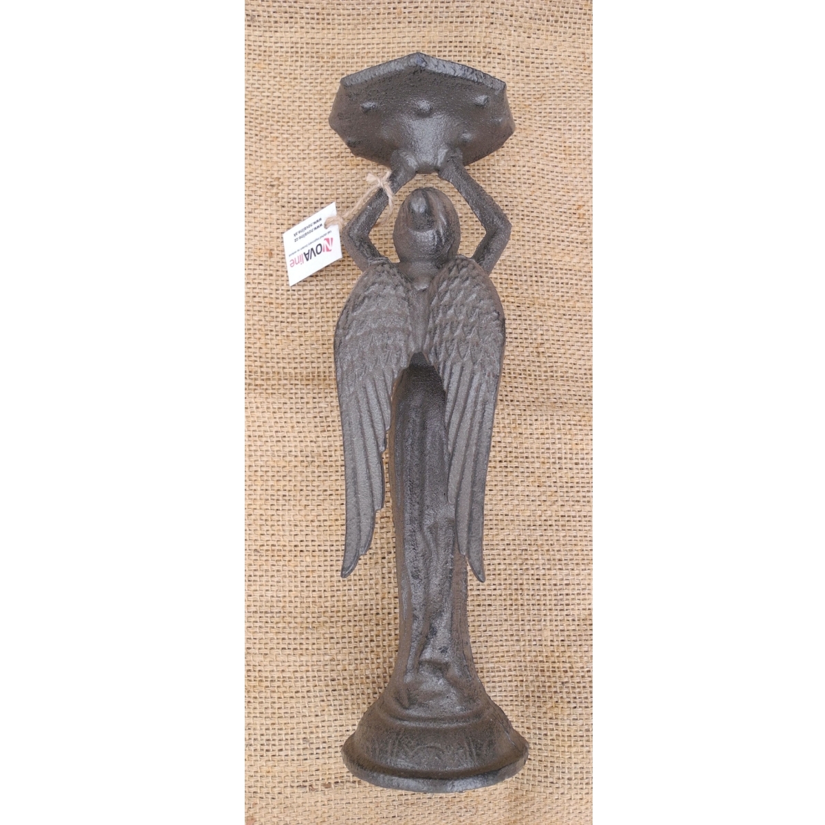 Liatinová soška anjela stojaca na okrúhlom, zdobenom podstavci, drží na rukách tácku s priemerom 11 cm, na ktorú môžete umiestniť čajovú, väčšiu valcovú alebo do kalichu v tácke postaviť kónickú sviečku.