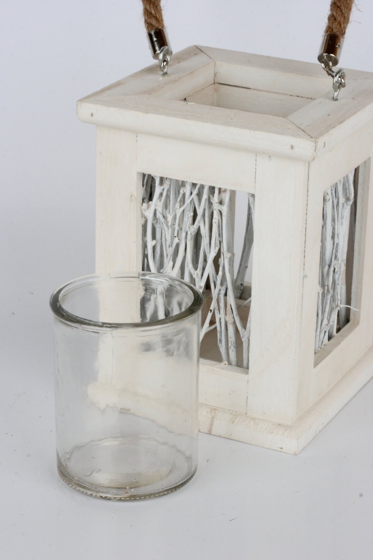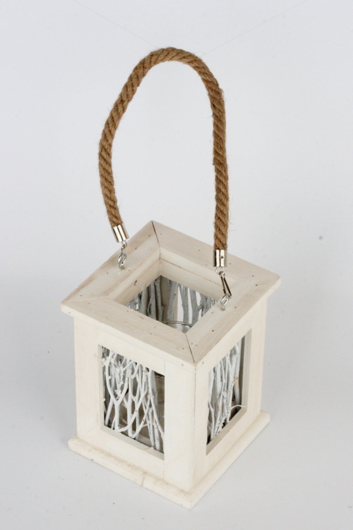 Biely dreveny svietnik s vetvičkami má pútko na zavesenie zo silnejšej jutovej prúžky. Po rozsvietenie vytvorí vetvičky krásnu štruktúru.