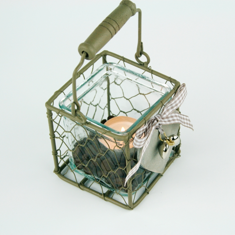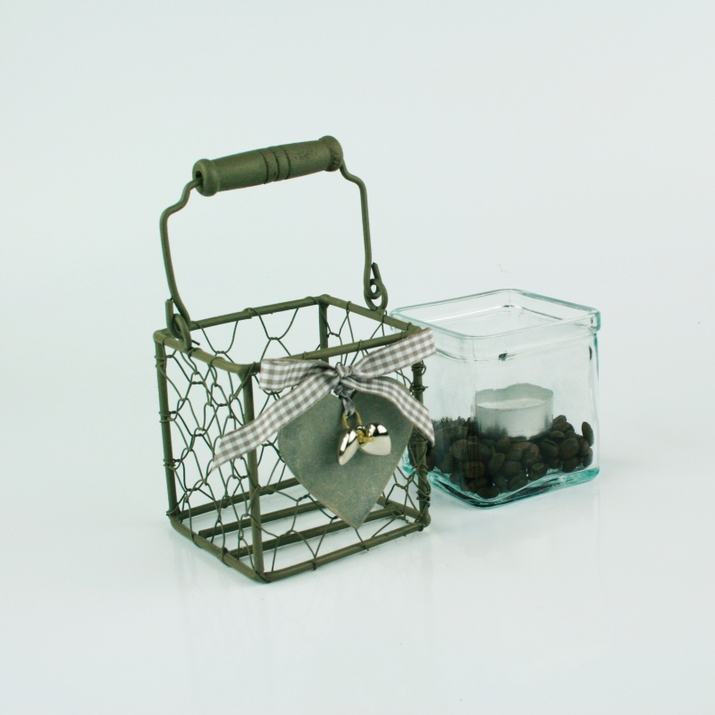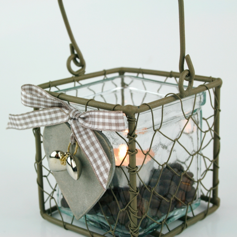 Svietnik na jednu čajovú sviečku. Košík má na prednej strane šedej srdce s malými prívesky strieborných srdiečok a veľkú hnedo-bielu kockovanú mašľu.
