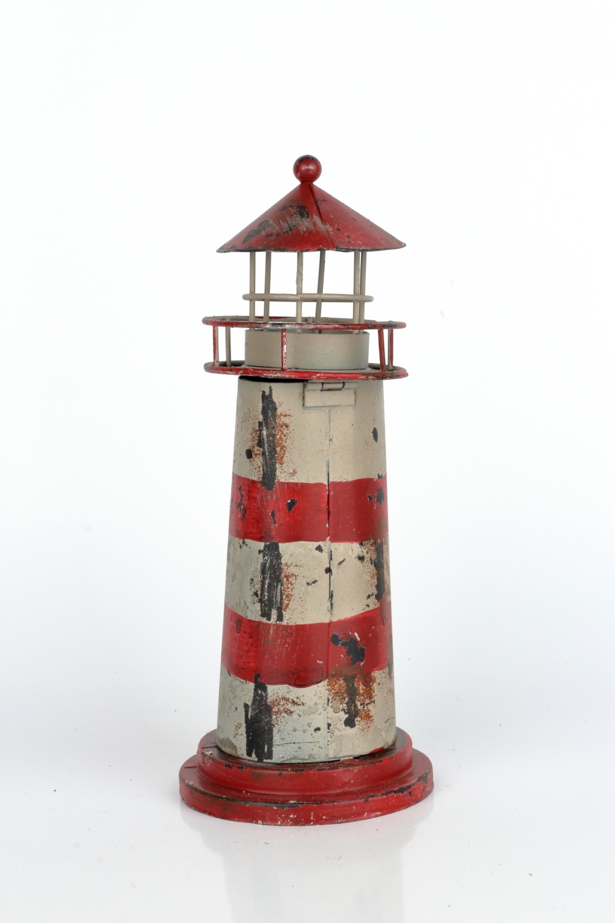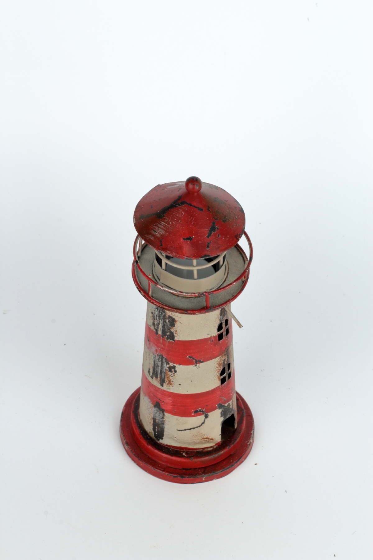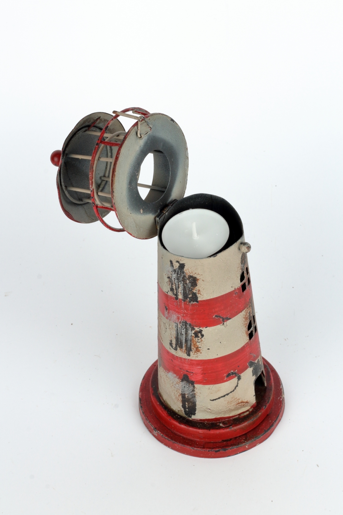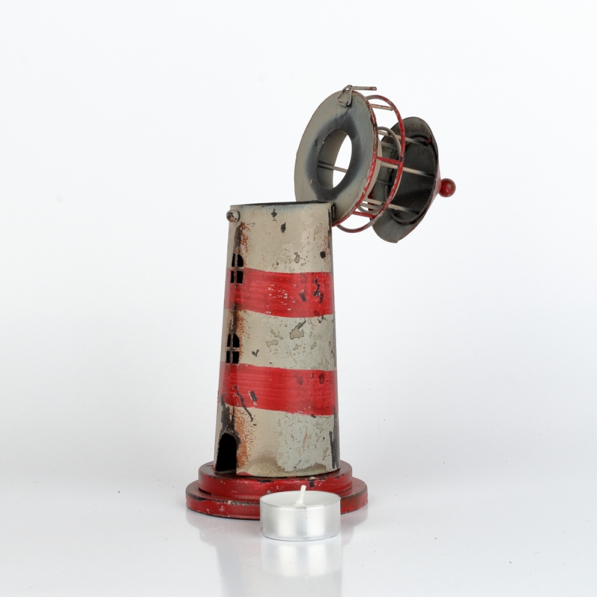 Plechový svietnik v tvare majáka má odklápací striešku, kam vložíte čajovú sviečku a po zapálení bude maják krásne svietiť.