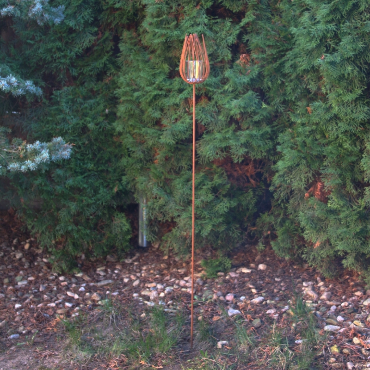 Dekorácia na chalupu svietnik so zápichom do trávnika.
