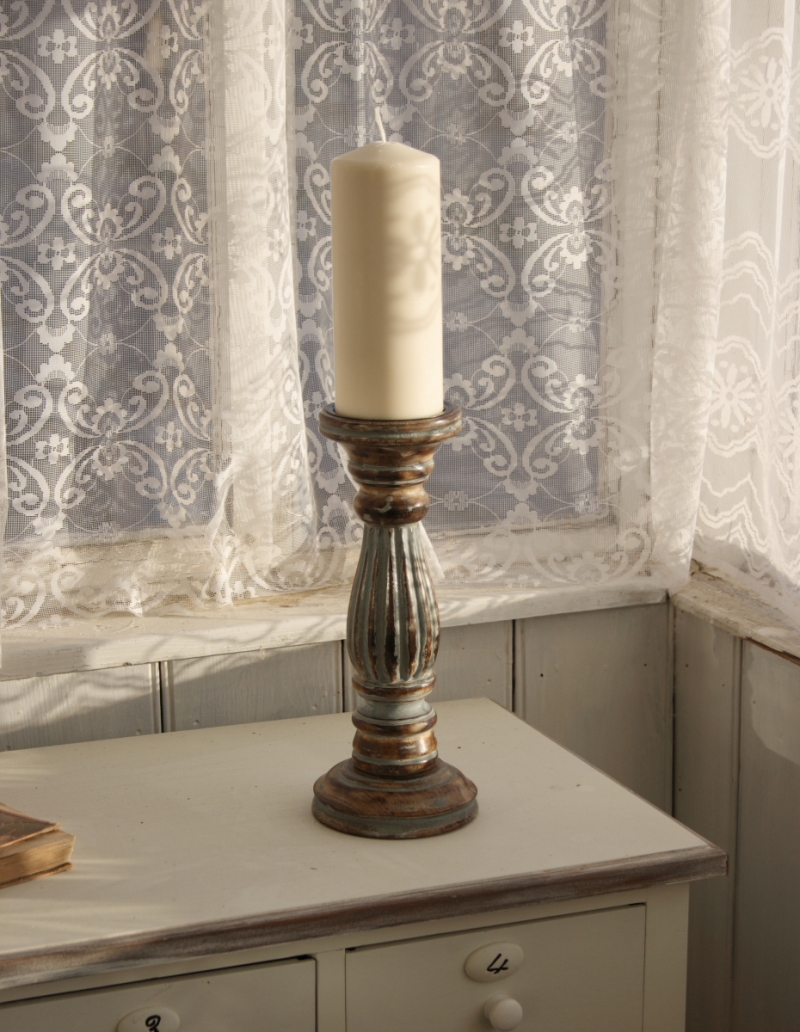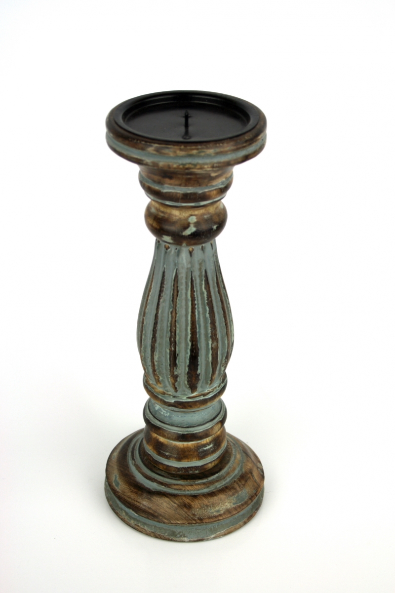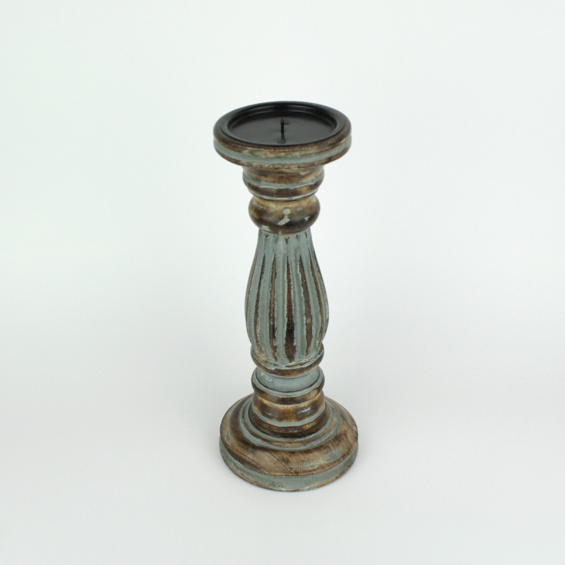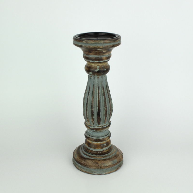 Svietnik na jednu sviečku sivý 31cm je masívny, drevený, ručne vyrezávaný svietnik v šedej a prírodnej farbe sa starožitnú patinou. Moderné šisovanie je ľahko do tyrkysova.
