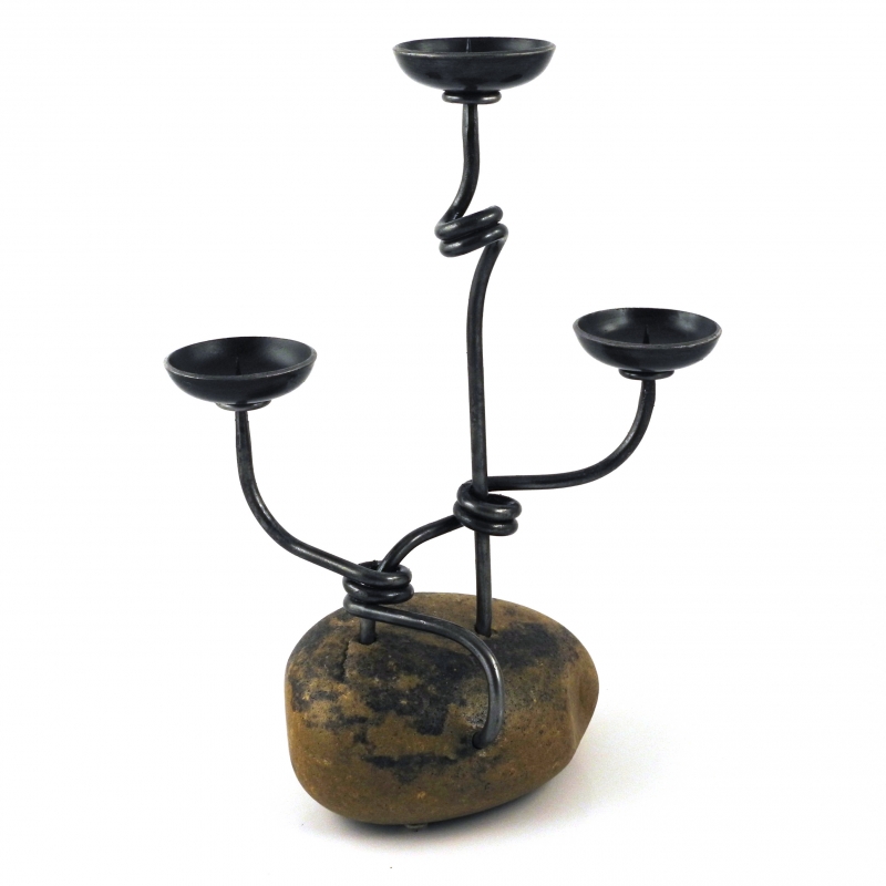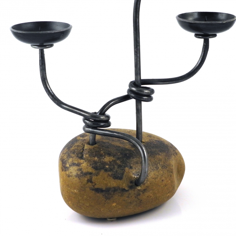 Svietnik môže mať mnoho podôb. Tento s výškou 39 cm, šírkou 29 cm je zasadený v kameni o veľkosti 18 x 12 cm. Misky na sviečky disponujú priemerom 75 mm. Svietnik kombinujúce prírodné materiály je ošetrený bezfarebným lakom. Aj laik na prvý pohľad spozná, že má pred sebou nevšedný výrobok vysokej umeleckej kvality. Autor, umelecký kováč ručí za stabilitu svojho zaujímavého výrobku. Svietnikom v tomto prevedení zaiste potešíte každého, koho sa ním rozhodnete obdarovať.