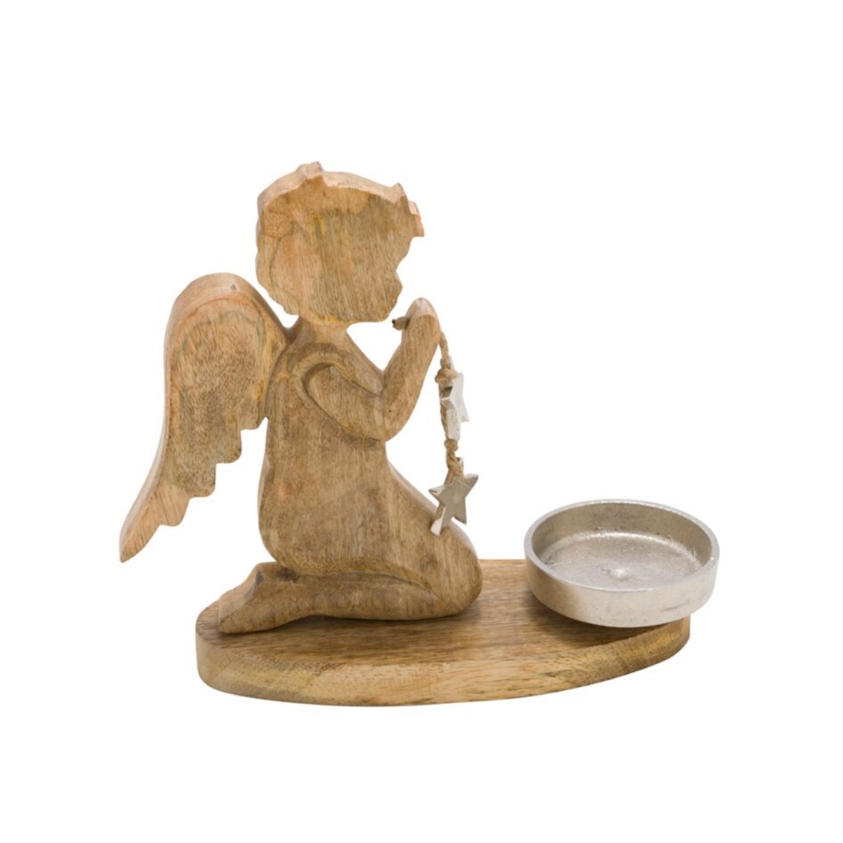 Svietnik z mangového dreva v tvare anjela modliaceho sa pri plamienku sviečky.