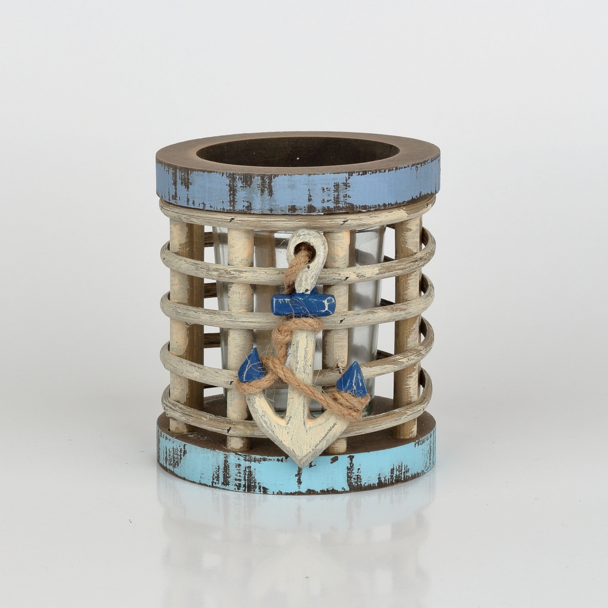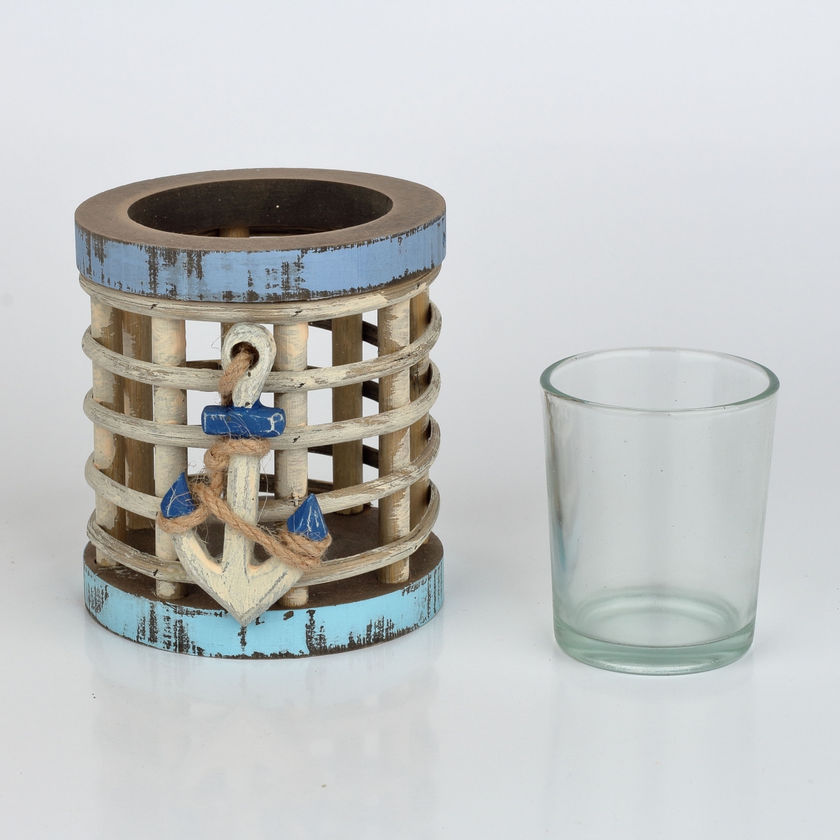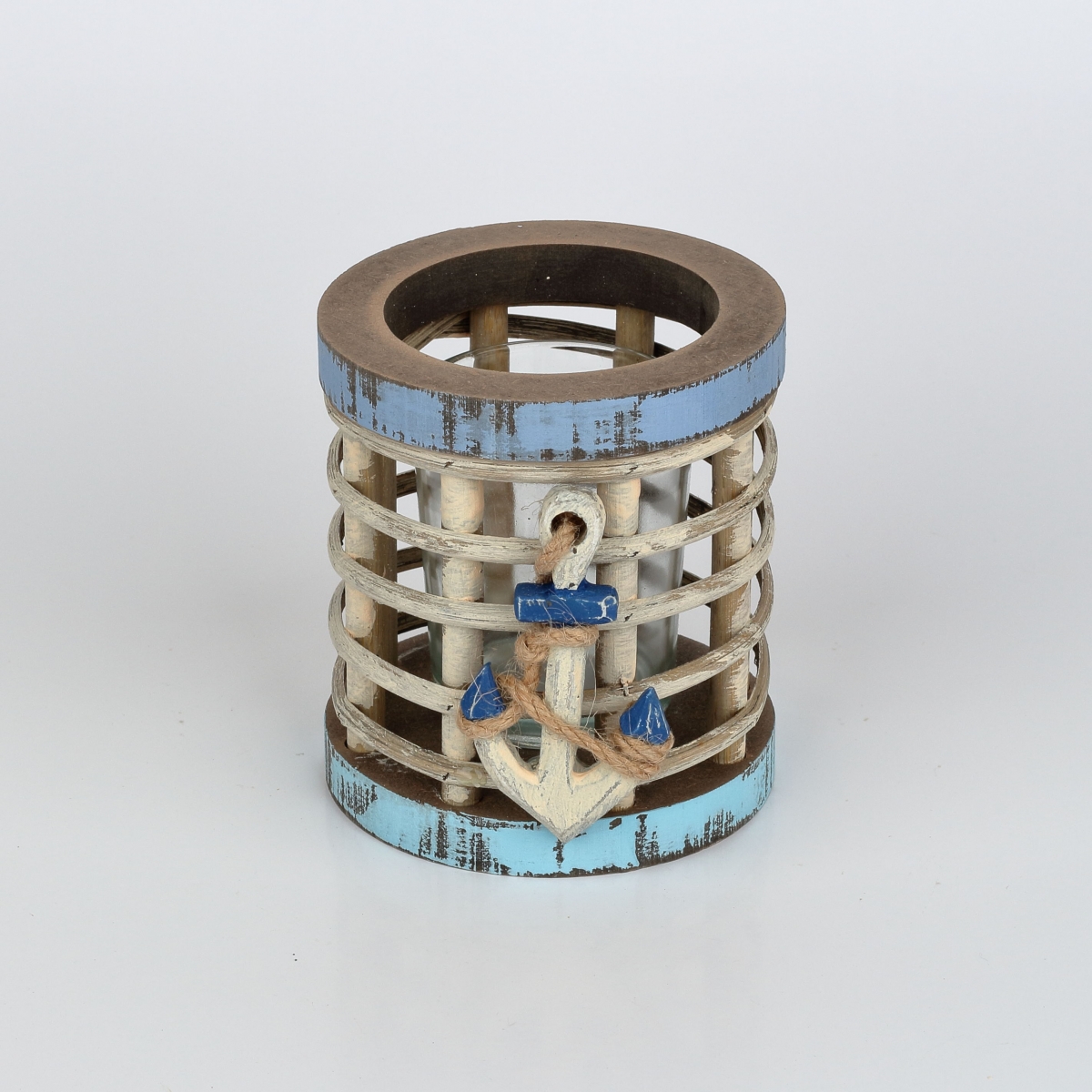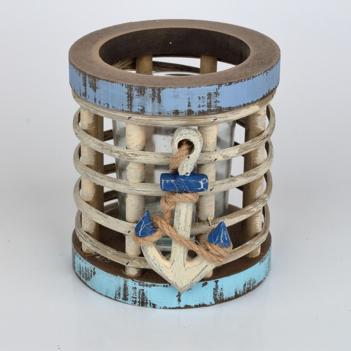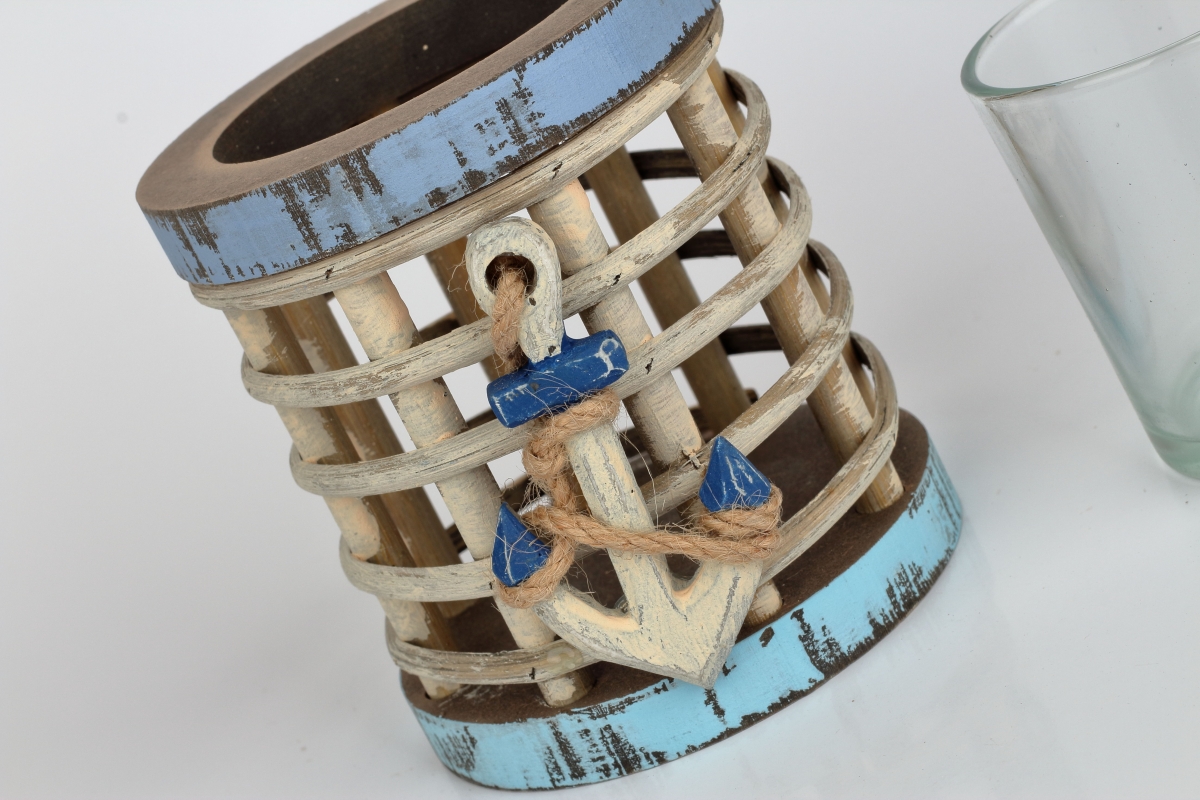 Svietnik 9x9x18cm s kotvou v rybárskom štýle, pre všetkých milovníkov mora a vody. Svietnik je drevený a jeho súčasťou je pohár na sviečku.