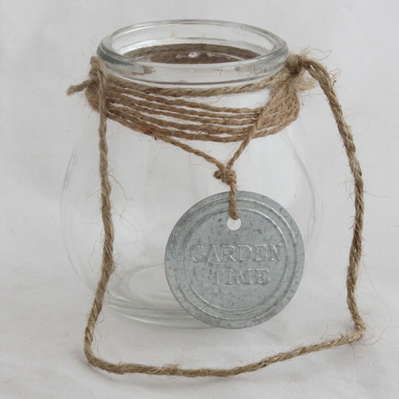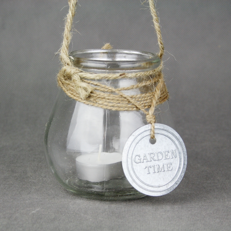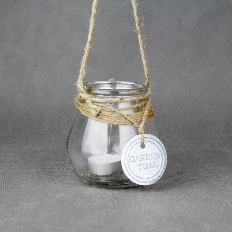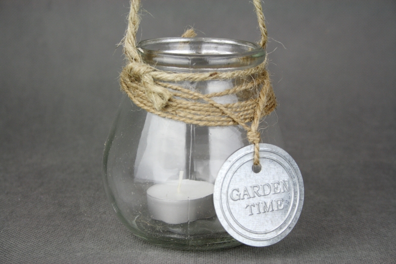 Svietnik sklenený vyrobený z jednoduchej sklenenej nádoby ozdobený jutovým povrázkom, z ktorého má aj ucho na zavesenie.