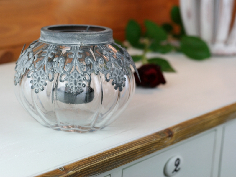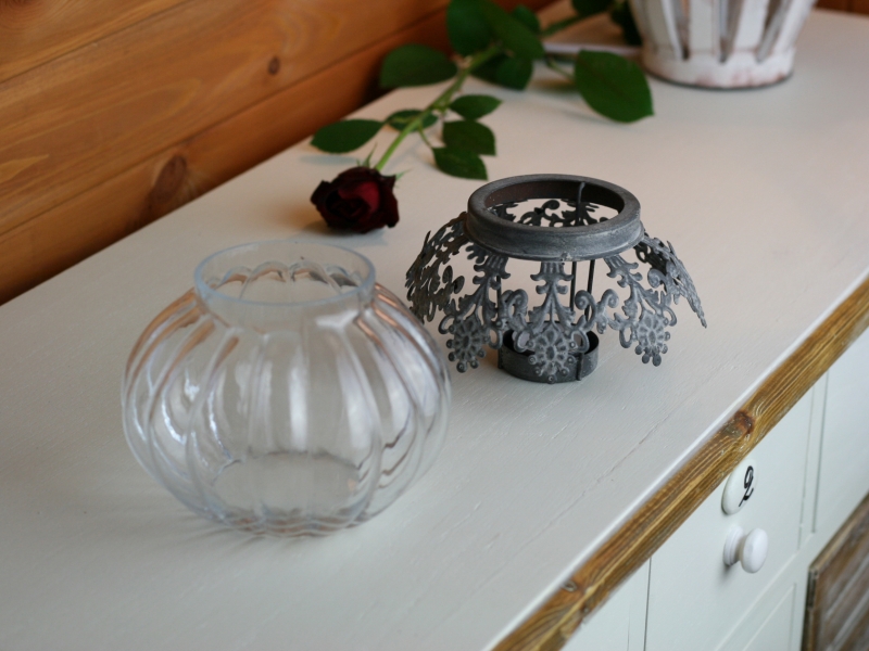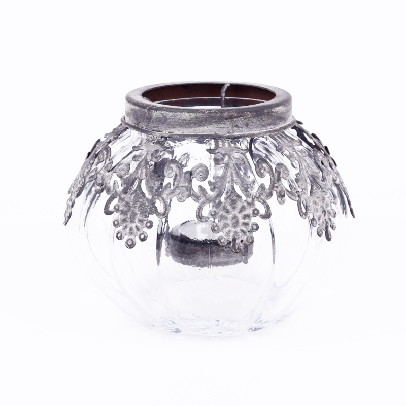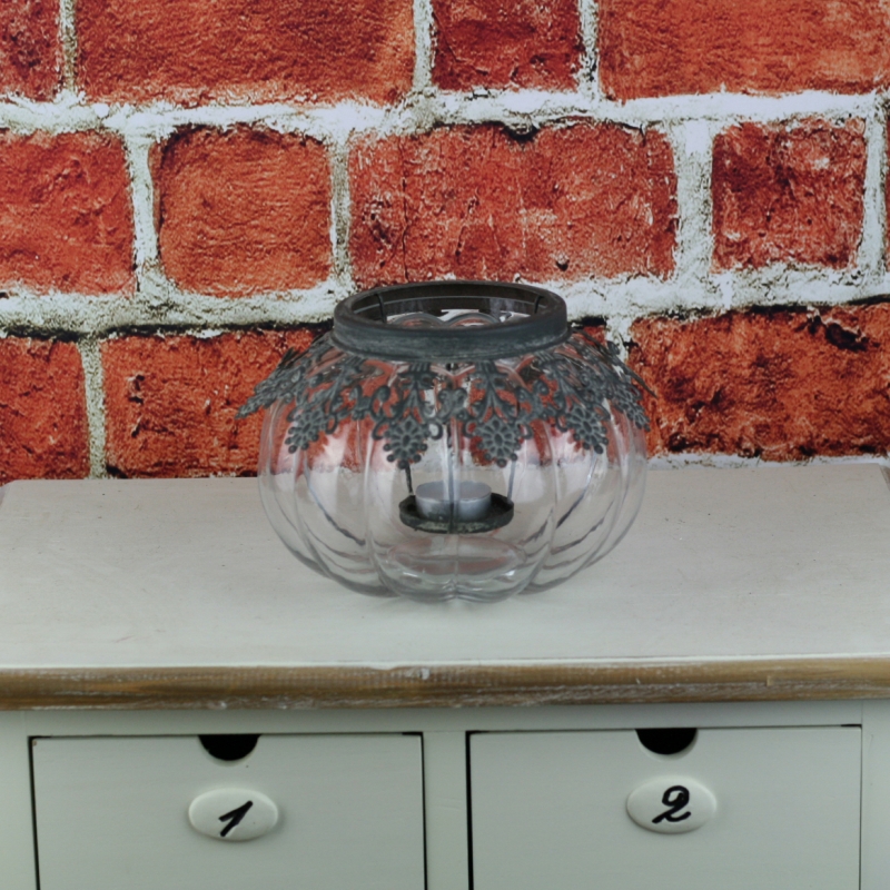 Svietnik Vintage 14cm ktorého sklenené telo pripomína tvar tekvica je ozdobené rkásnou kovovou vložkou na čajovú sviečku. Ako praktické. Kovové zdobenie jednoducho vytiahnete z nádoby a zapálenú sviečku umiestnite do kalíška.