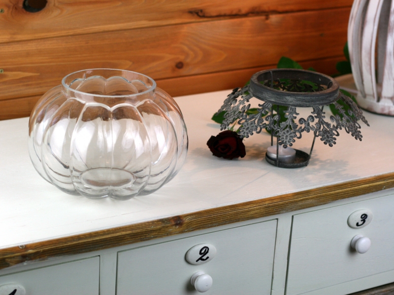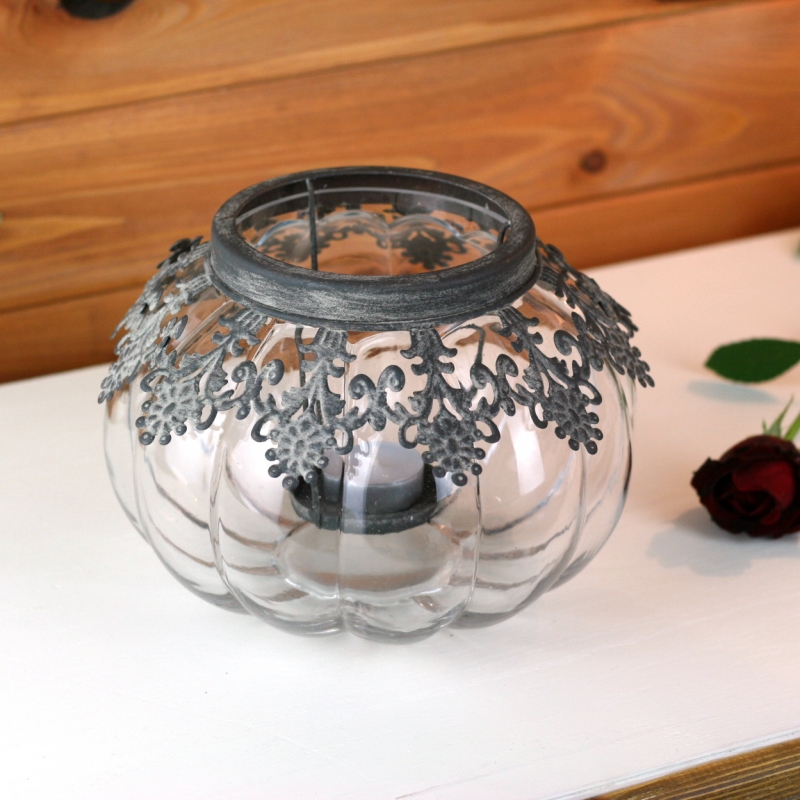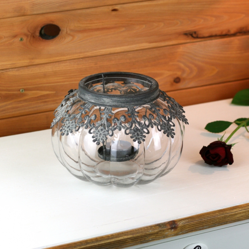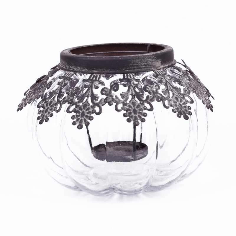 Svietnik Vintage 16 cm ktorého sklenené telo pripomína tvar tekvica je ozdobené krásnou kovovou vložkou na čajovú sviečku. Ako praktické. Kovové zdobenie jednoducho vytiahnete z nádoby a zapálenú sviečku umiestnite do kalíška.