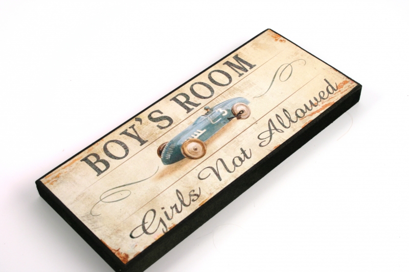 Tabuľka Boys Room každému napovedá , že za dverami s touto ceduľkou sa nachádza chlapčenské kráľovstvo . A kto by nechcel anglickým slovíčkam rozumieť , rozlúšti tajomstvo vďaka obrázku , veď máloktorá dievčatko by si na svoj izbičku věsila obrázok autíčka .