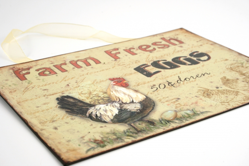 Tabuľka nesie anglický nápis Farm Fresh Eggs . Každému , aj keď práve po anglicky nevie , je jasné , že ide o označenie hydinové farmy . Je však na veci každého , kam si pôsobivú retrocedulku pripevnia .