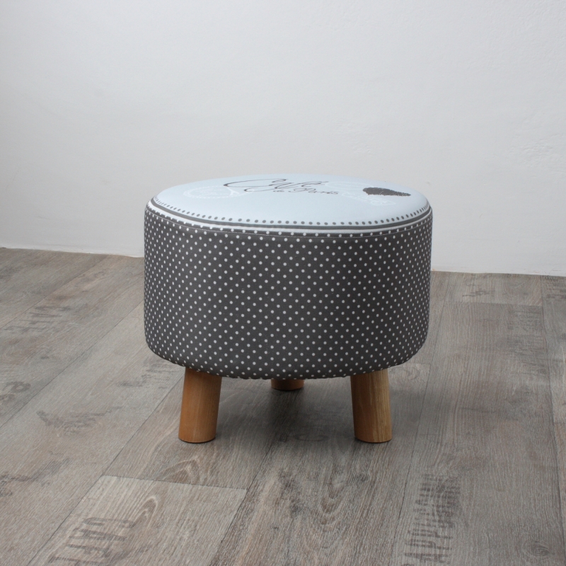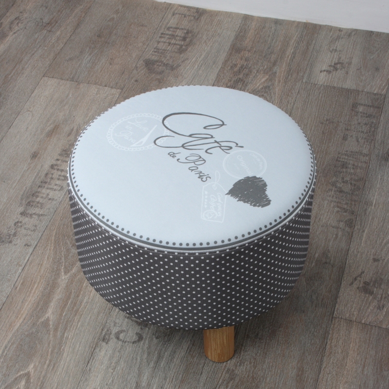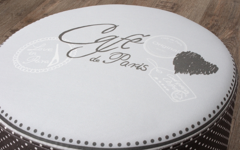 Poťah taburetky je prateľný a tak sa nemusíte báť ho naplno využívať každý deň. Sedák má bočnej strane látku s drobnými bodkami a vrchná časť s nápisom Cafe de Paris. Jemné neutrálne tóny robia z taburetu univerzálny kus nábytku do každej obývacej izby. V estejném dizajne nájdete v kategórii Bytový textil tiež obliečky na vankúše.