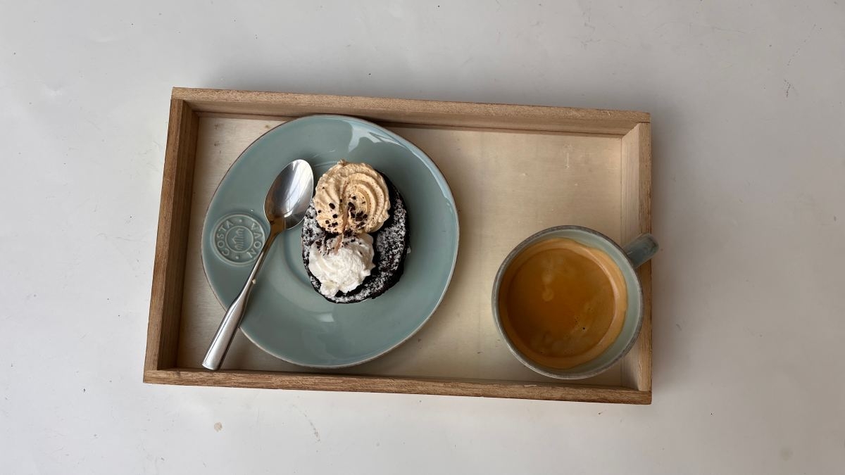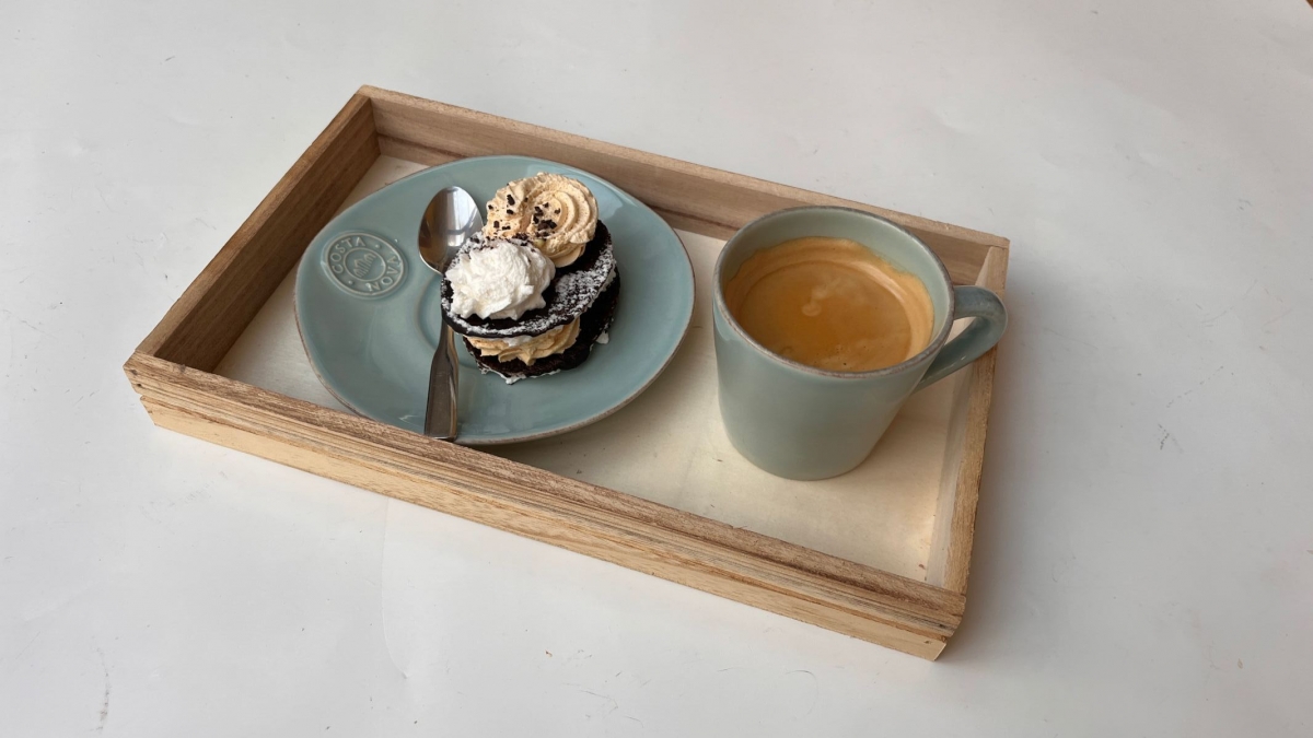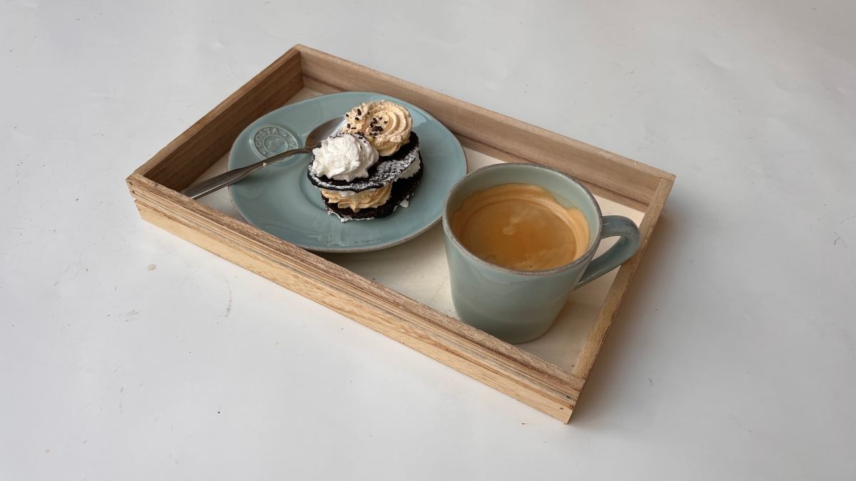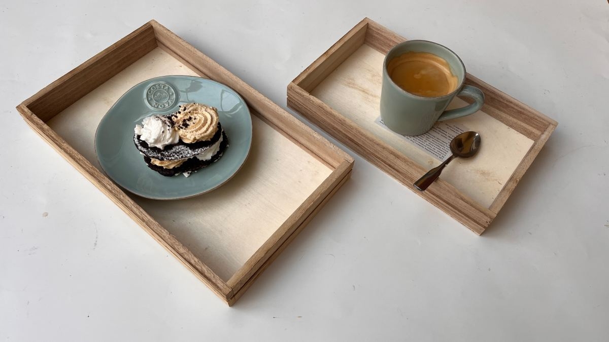 Drevený podnos obdĺžnikový môže slúžiť aj ako štýlová dekorácia. Menšia tácka je vložená v priestore veľkého.