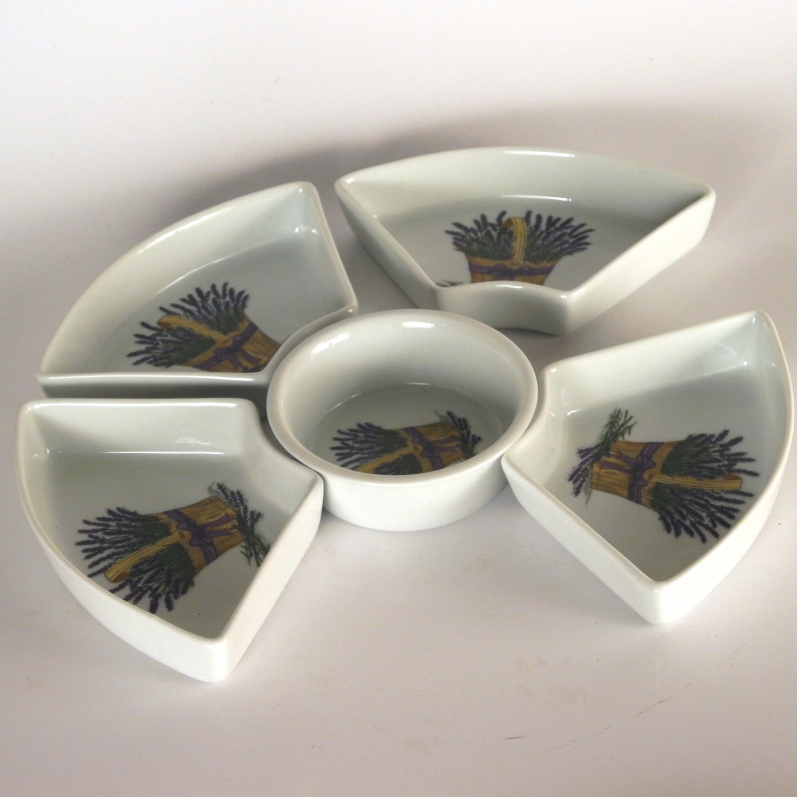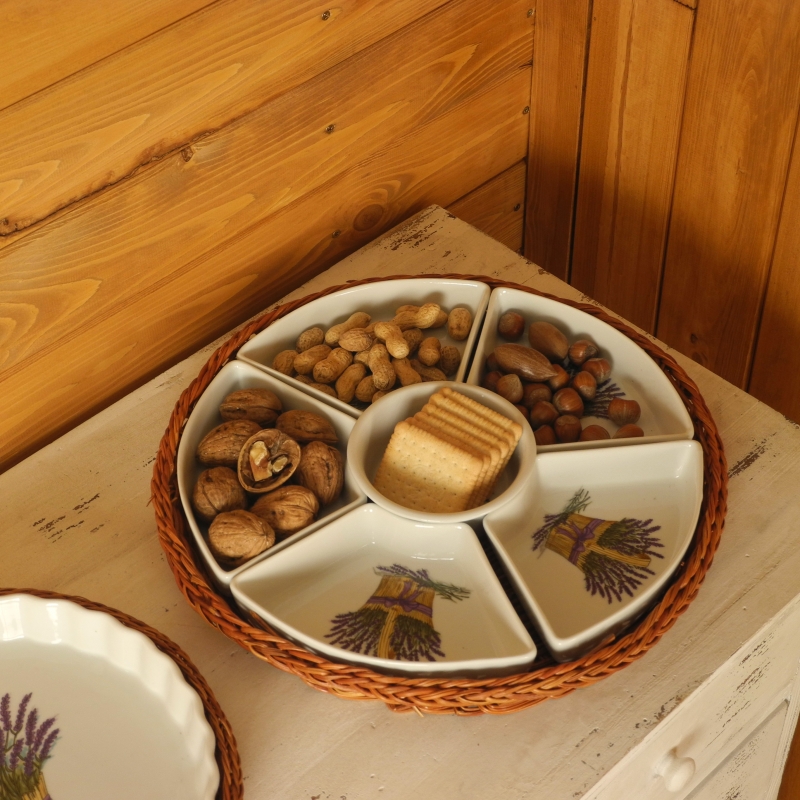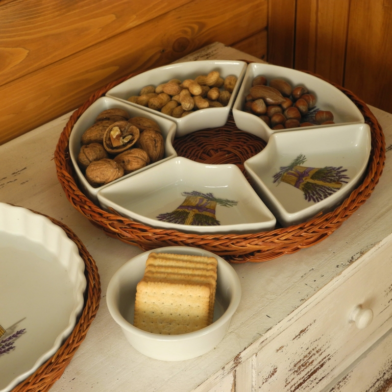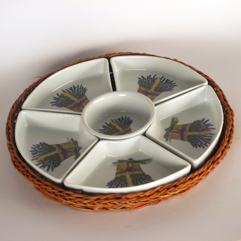 Tác keramický představuje zajímavý a praktický kuchyňský doplněk. Průměr keramického tácku je 32cm, s proutěným košíkem, v němž je uložen pak 35cm. Tácek je vysoký 4.5cm.Prostřední miska má průměr 11.5cm a je obklopena pěti dalšími miskami.Na každém z šesti dílů keramického tácu je namalován trs levandule.