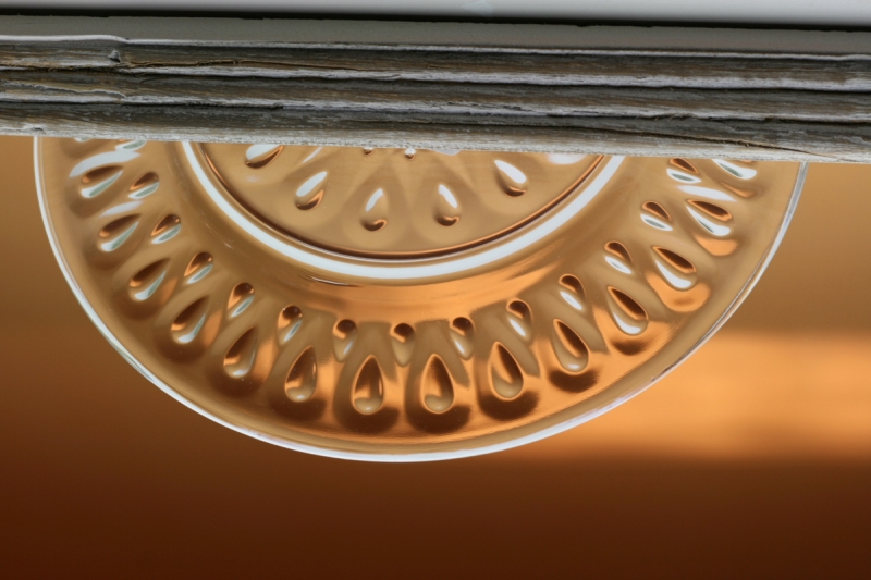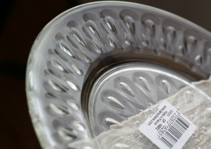 Tanier z lisovaného skla so zdobením v mandľovom tvare. Zdobenie má na okraji taniera aj na stredu.
