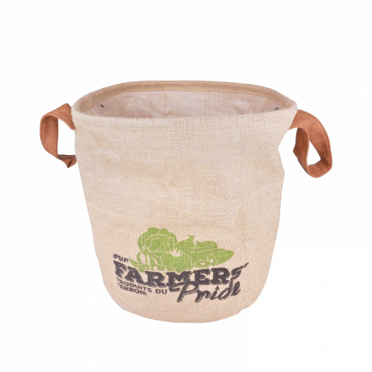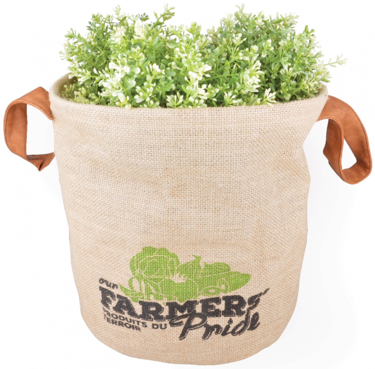 Jutová taška má dva postranné úchopy. Taška je vhodná ako obal na bylinky či rastliny v kvetináči, vďaka odtokovým otvorom na dne. Dodáva sa v prírodnom dizajne s farebnou potlačou motívu zeleniny a nápisu FARMERS Pride.