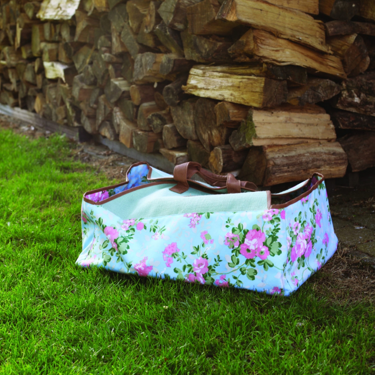 Každé romantické srdce zaplesá nad touto taškou na dřevo. Motiv růžových růží na světle modrém podkladu, je doplněn zelenou horní částí s hnědými uchy a lemováním.