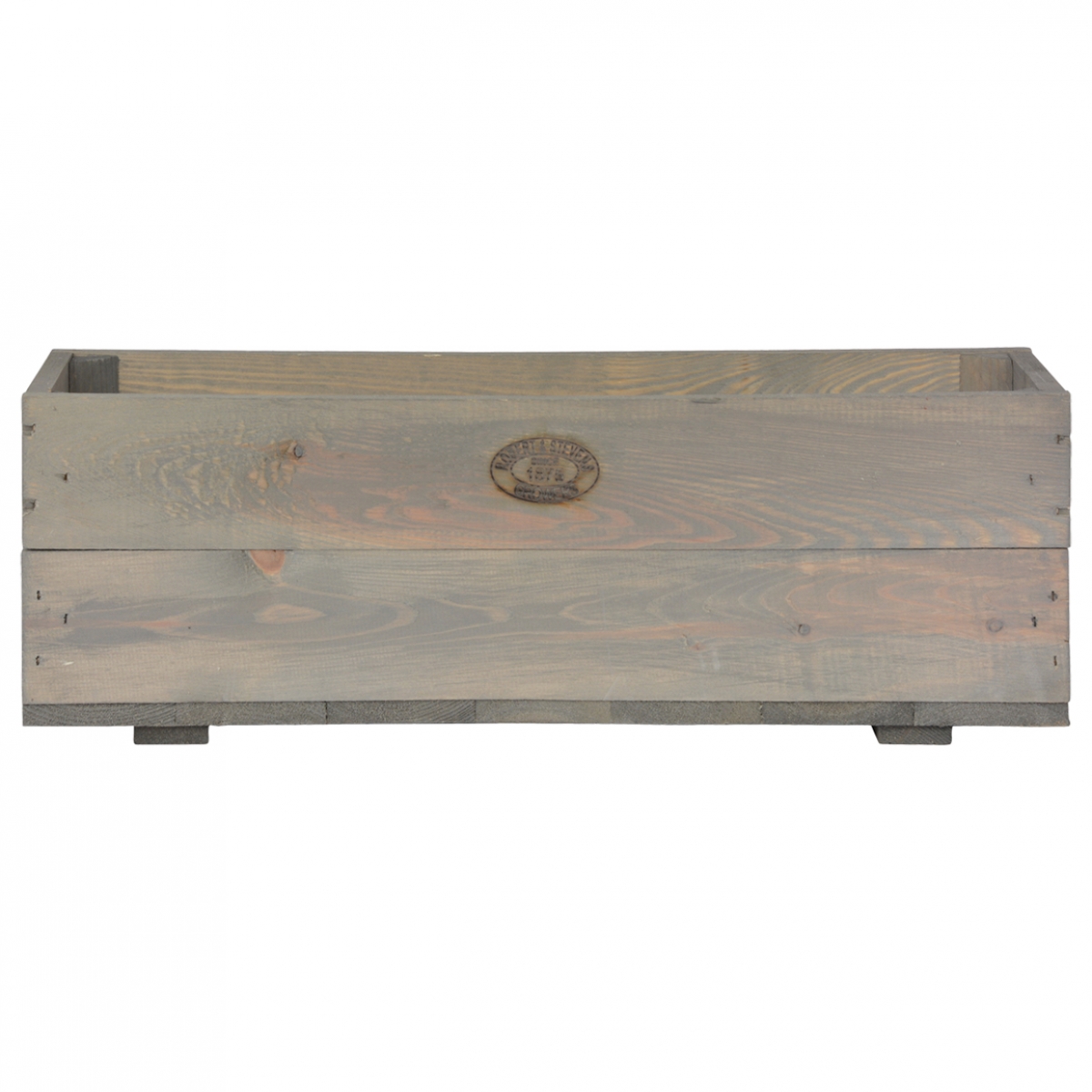 Truhlík drevený v prírodnom farebnom spracovaní s sivou patinou a vypáleným logom ROBERT and STEVENS, SINCE 1875, GROWERS.