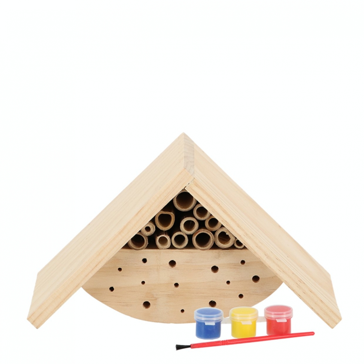 Sada sa skladá z hmyzieho hotela, 3 maliarskych farieb a štetca.