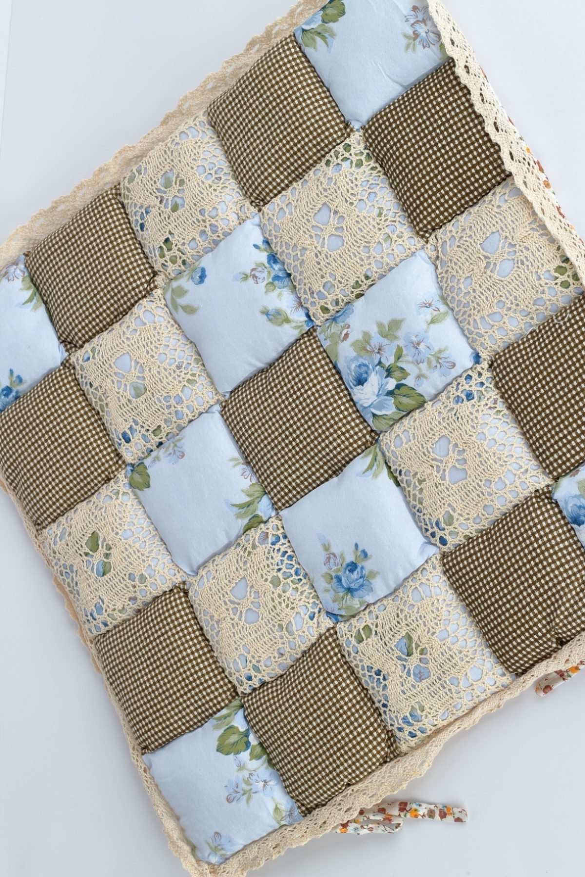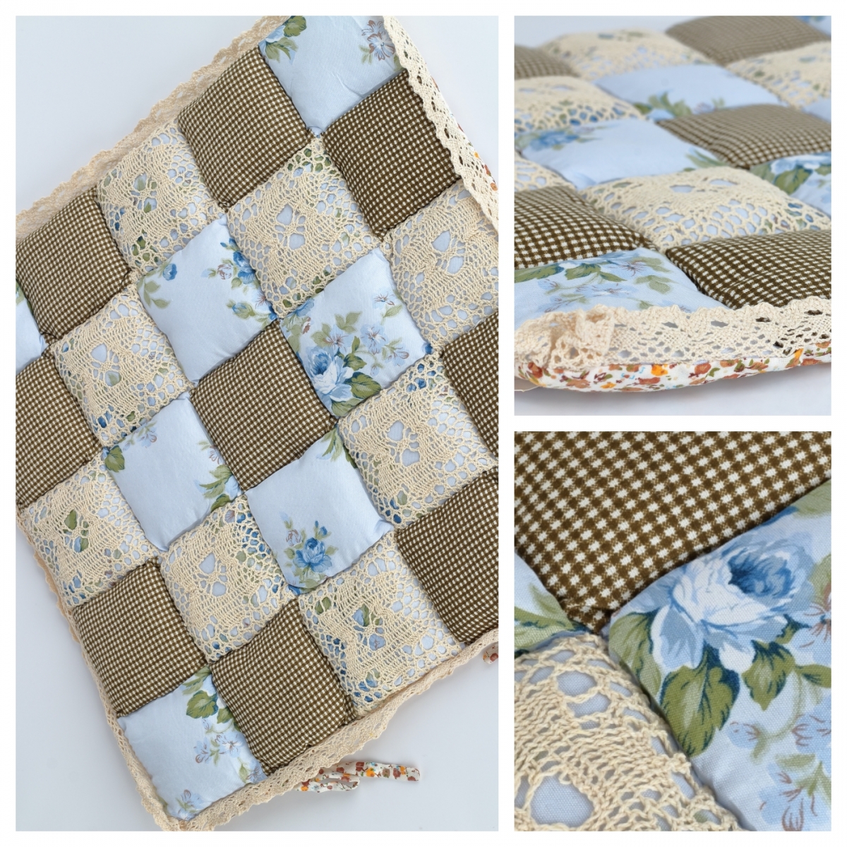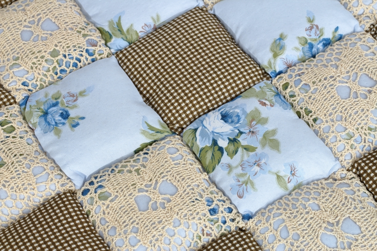 Vankúš na stoličku v béžovo-hnedej farbe s motívom patchworku