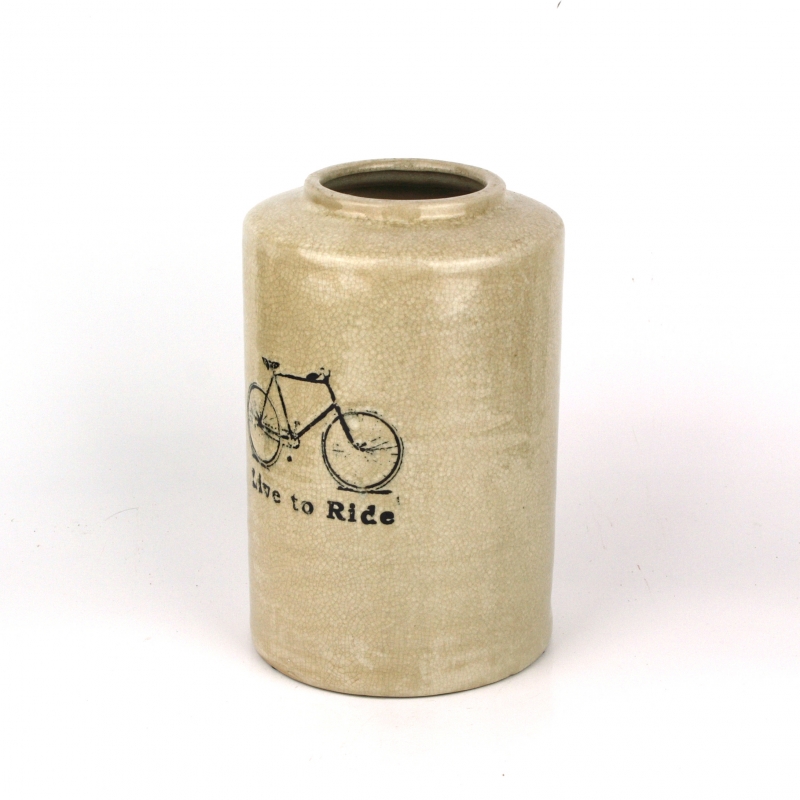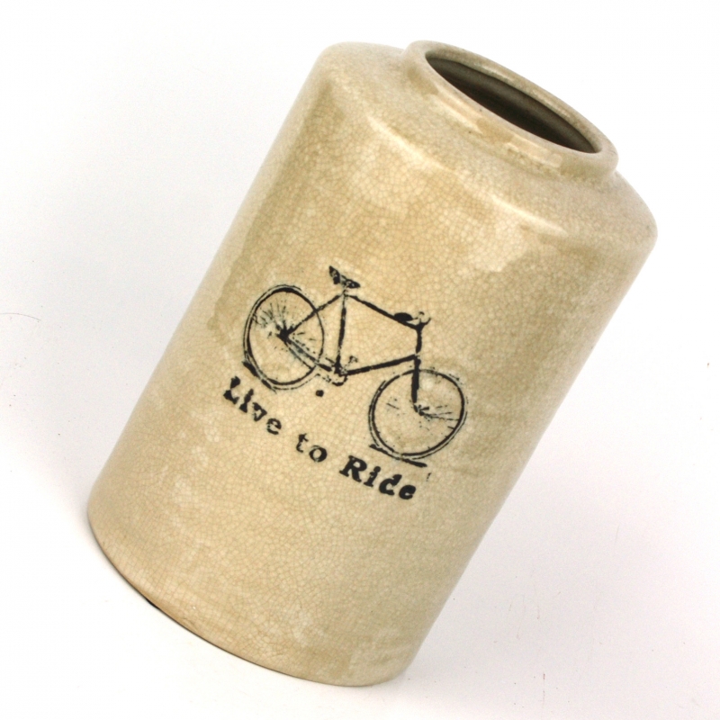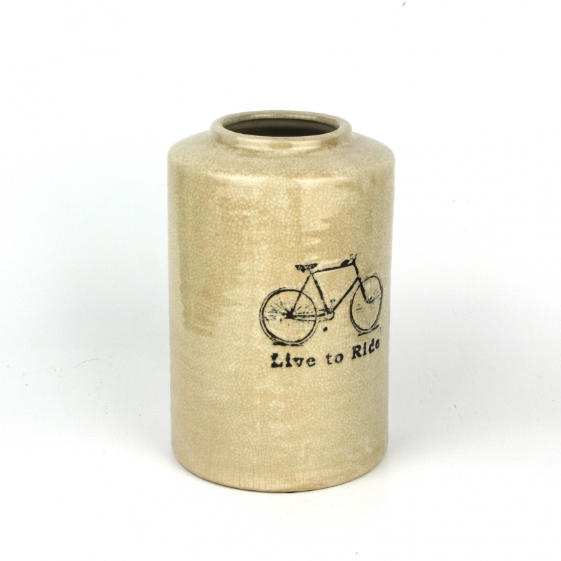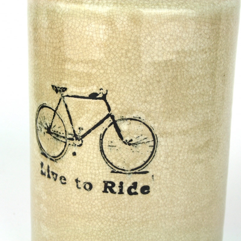 Váza s nápisom Live to Ride a obrázkom kolesá.
