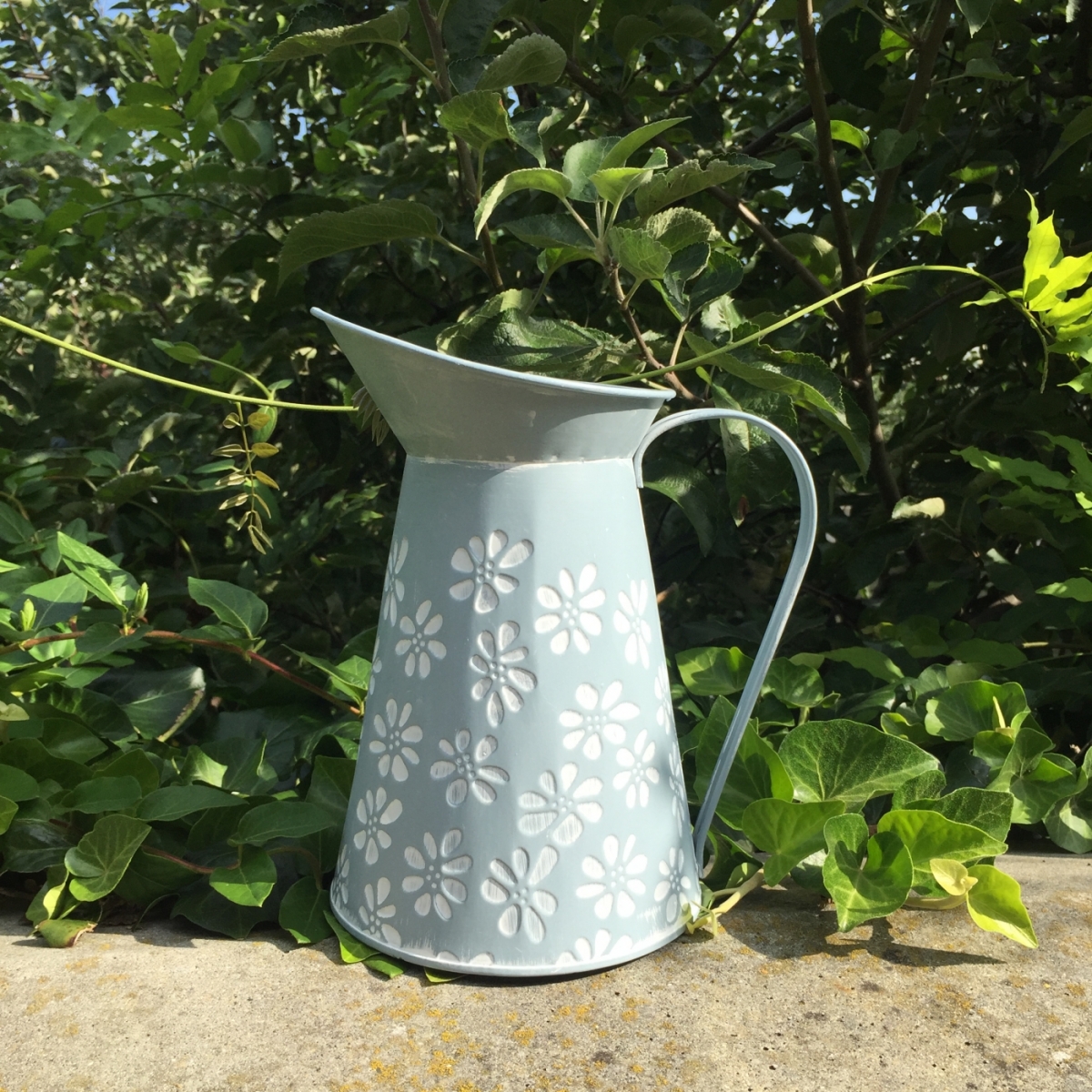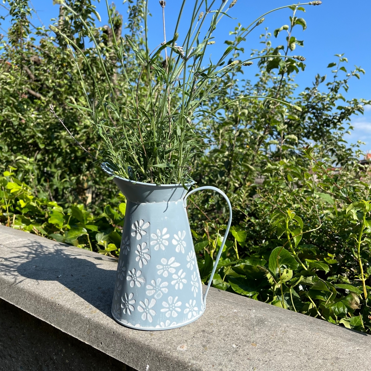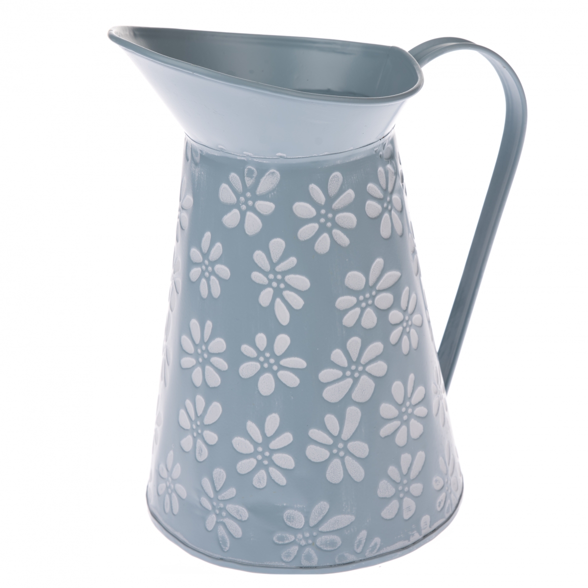 Váza kovová v tvare kanvičky vo farbe letnej oblohy má do svojho plášťa vtlačenú celú lúku jemných kvietkov. Ako závoj potom pôsobí ľahká biela patina ktorou je pokrytý povrch kanvičky.