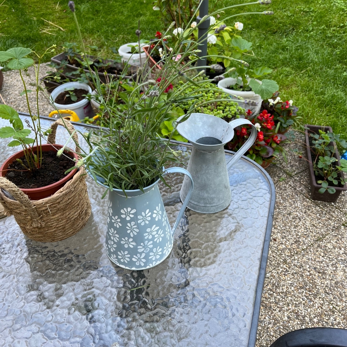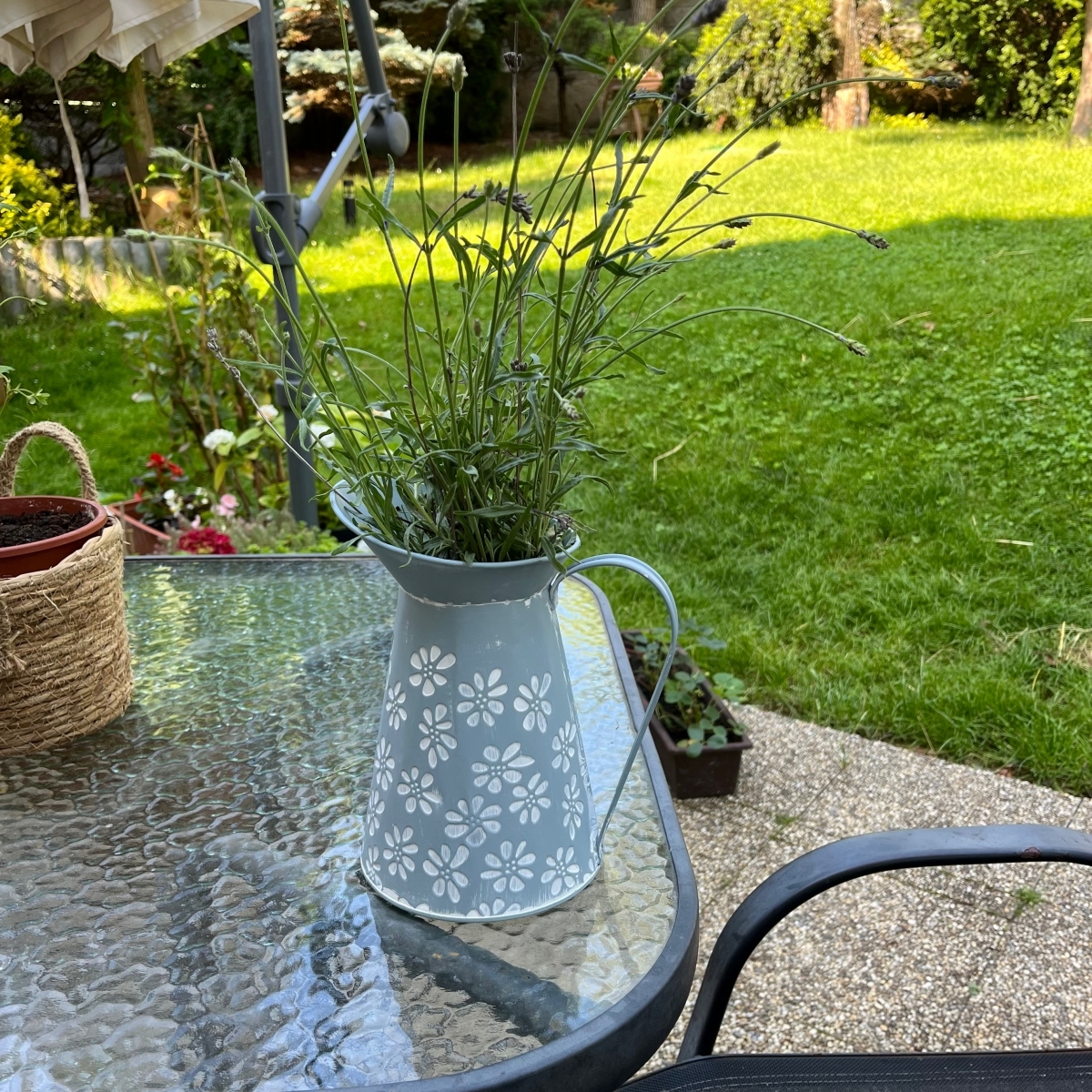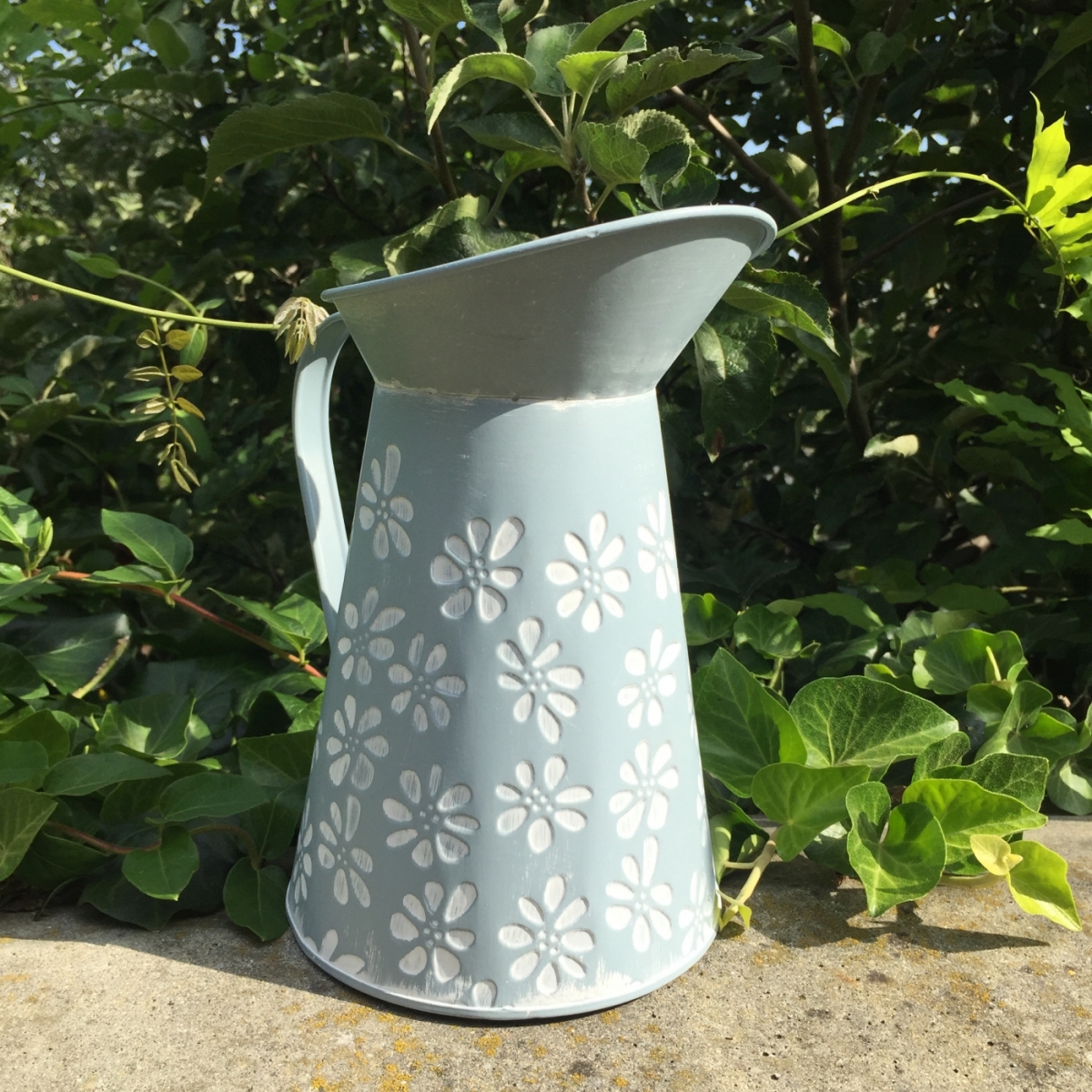 Váza kovová v tvare kanvičky vo farbe letnej oblohy má do svojho plášťa vtlačenú celú lúku jemných kvietkov. Ako závoj potom pôsobí ľahká biela patina ktorou je pokrytý povrch kanvičky.