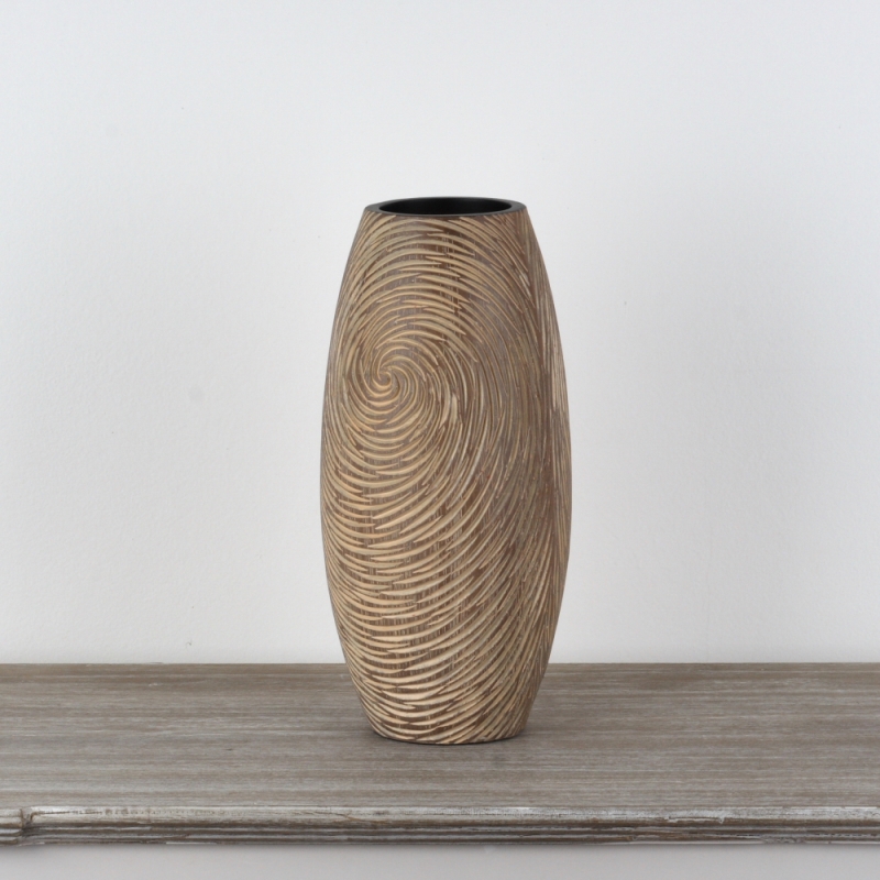 Vysoká váza má po celom povrchu vytvorený ornament rytím. V rovnakom dizajne nájdete v ponuke tiež svietnik, lampu alebo dekoračné guľu.