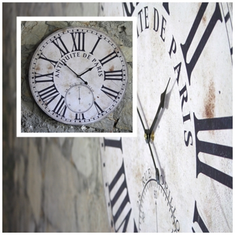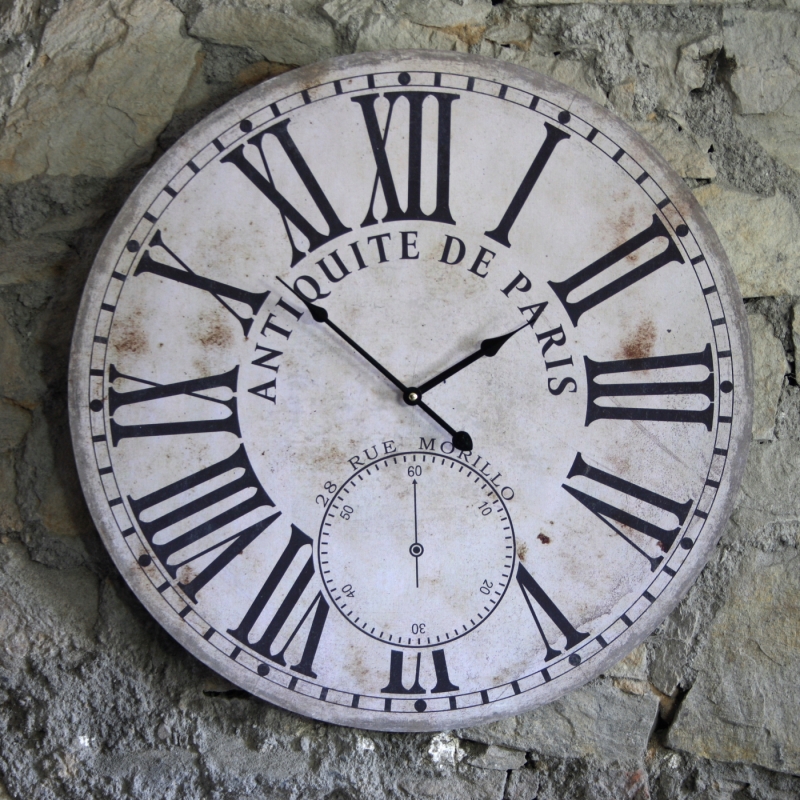 Veľké hodiny s rímskymi číslicami majú ľahko ošúchaný a opotrebovaný vzhľad, ktorý k veciam s francúzskym šarmom neodmysliteľne patrí.