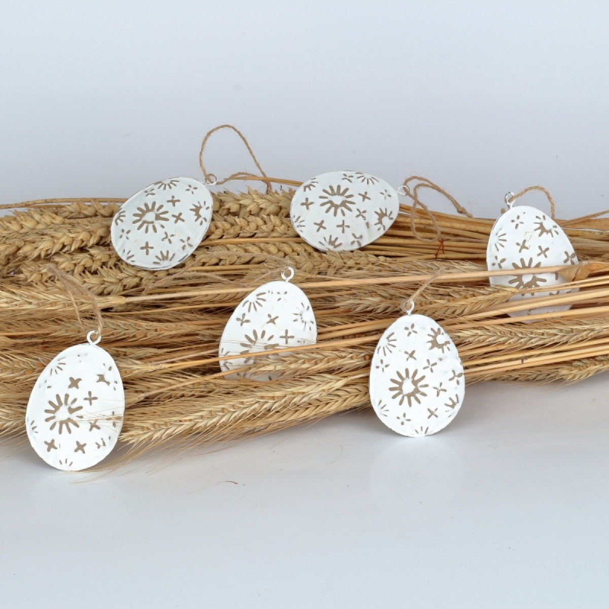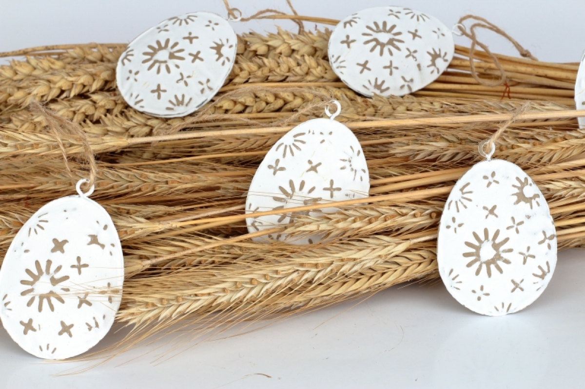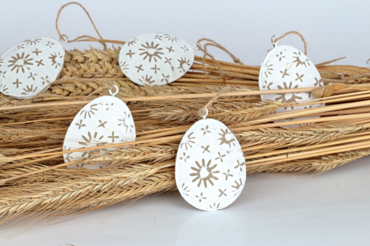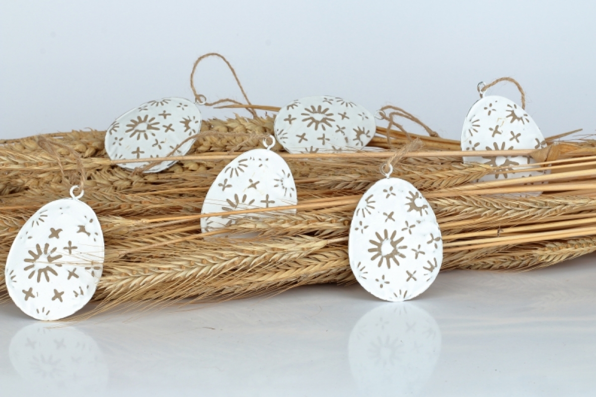 Veľkonočné vajíčka kovová 6ks 7x5cm zaveste na vetvičky vo váze, alebo nimi ozdobte veniec na dvere aj aranžmány v truhlíka. Závesné kovové dekorácie využijete na 100 spôsobov, každý rok inak.