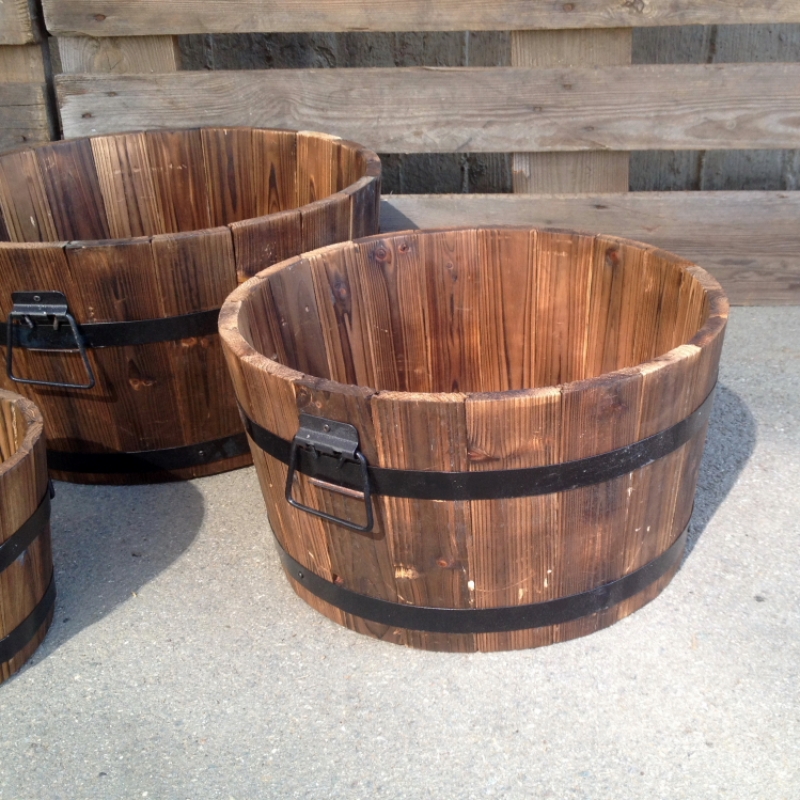 Tento kade neslúži na vodu, ale ako okrasný obal na kvetináč do domu, na záhradu či terasu. Drevený kýbel s krásnou kresbou dreva je doplnený o kovové doplnky.