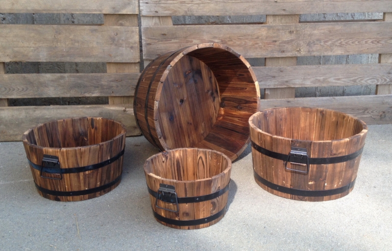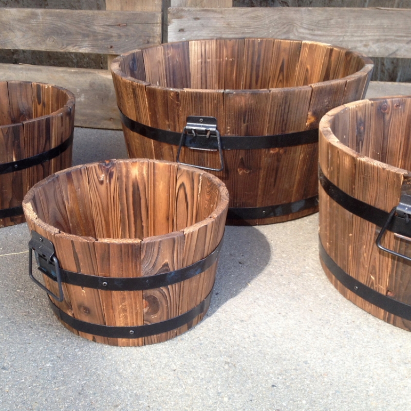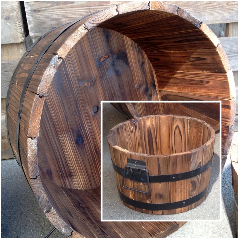 Tento kade neslúži na vodu, ale ako okrasný obal na kvetináč do domu, na záhradu či terasu. Drevený kýbel s krásnou kresbou dreva je doplnený o kovové doplnky.
