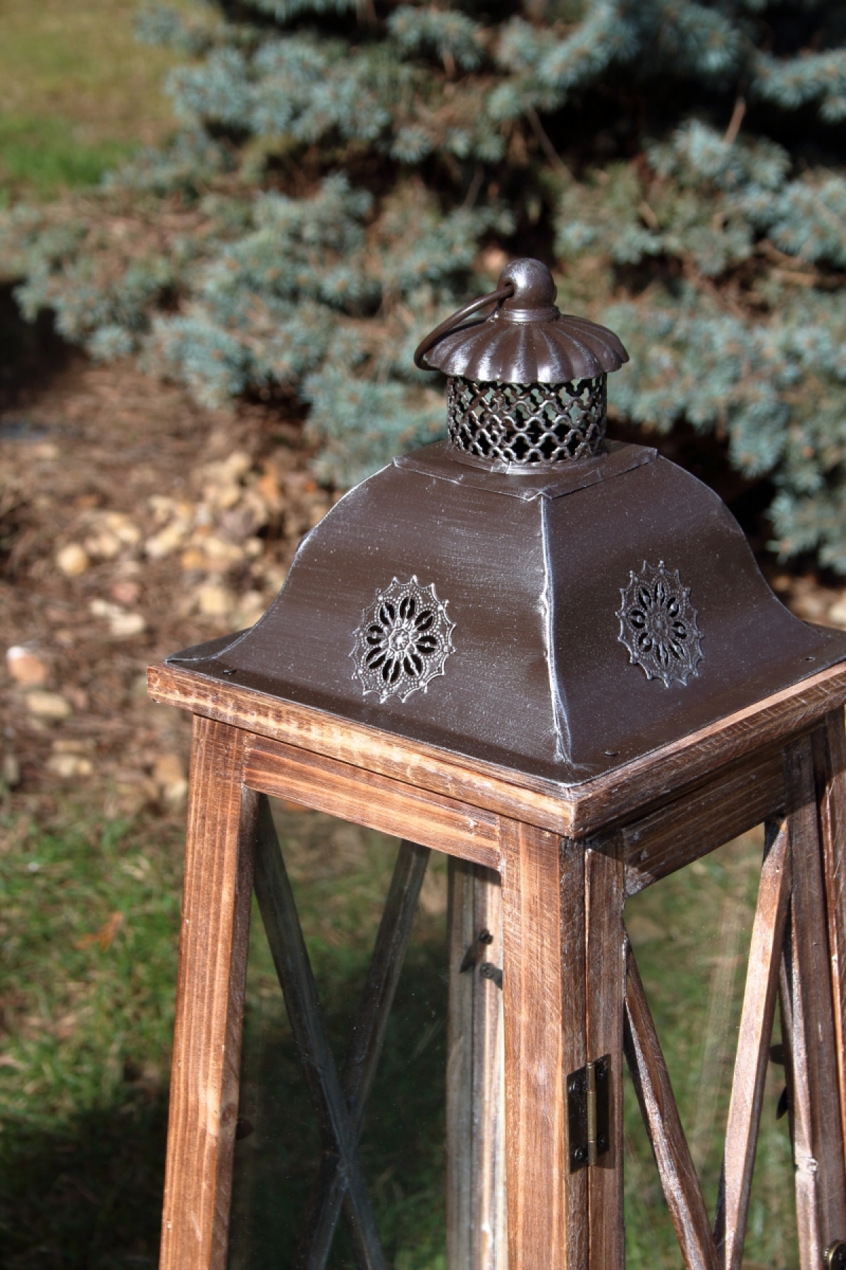 Veľká drevená lucerna má perforovanú plechovú striešku s kovovým krúžkom pre bezpečné prenášanie či zavesenie na stenu.