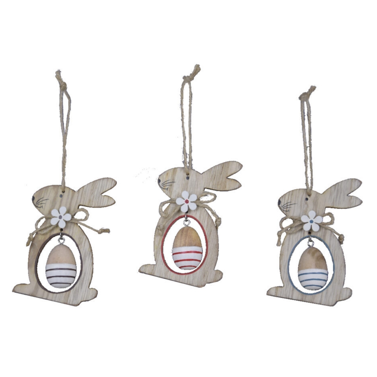 Každý zo zajačikov má okolo krku mašľu z jutového povrázku ozdobenou kvetinou a vo vnútri bruška prívesok v tvare vajca.