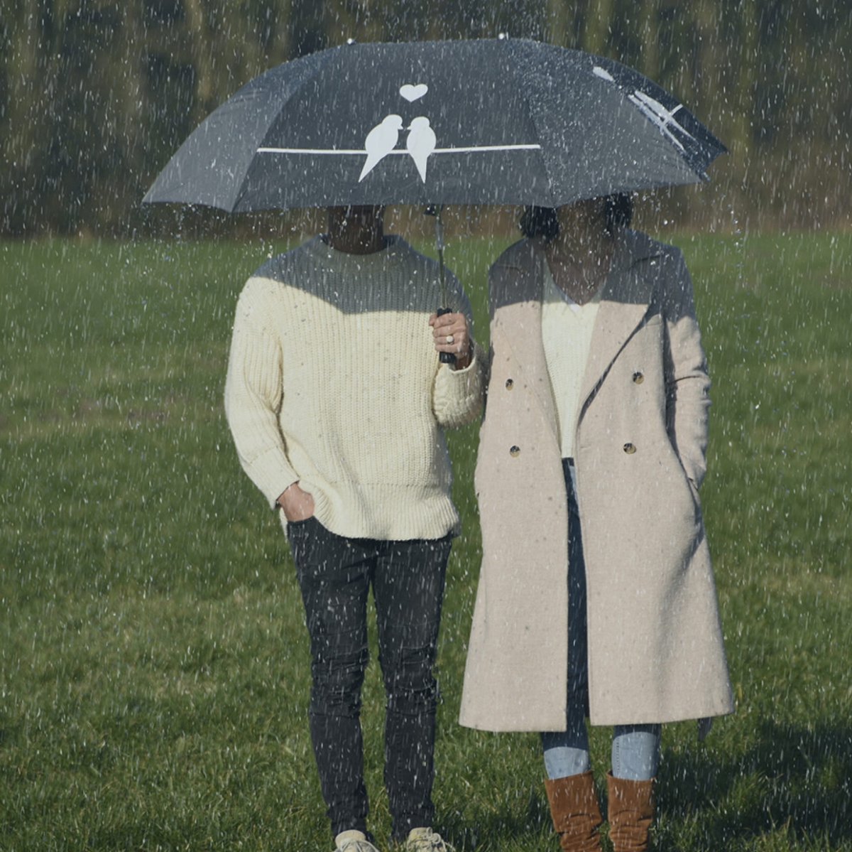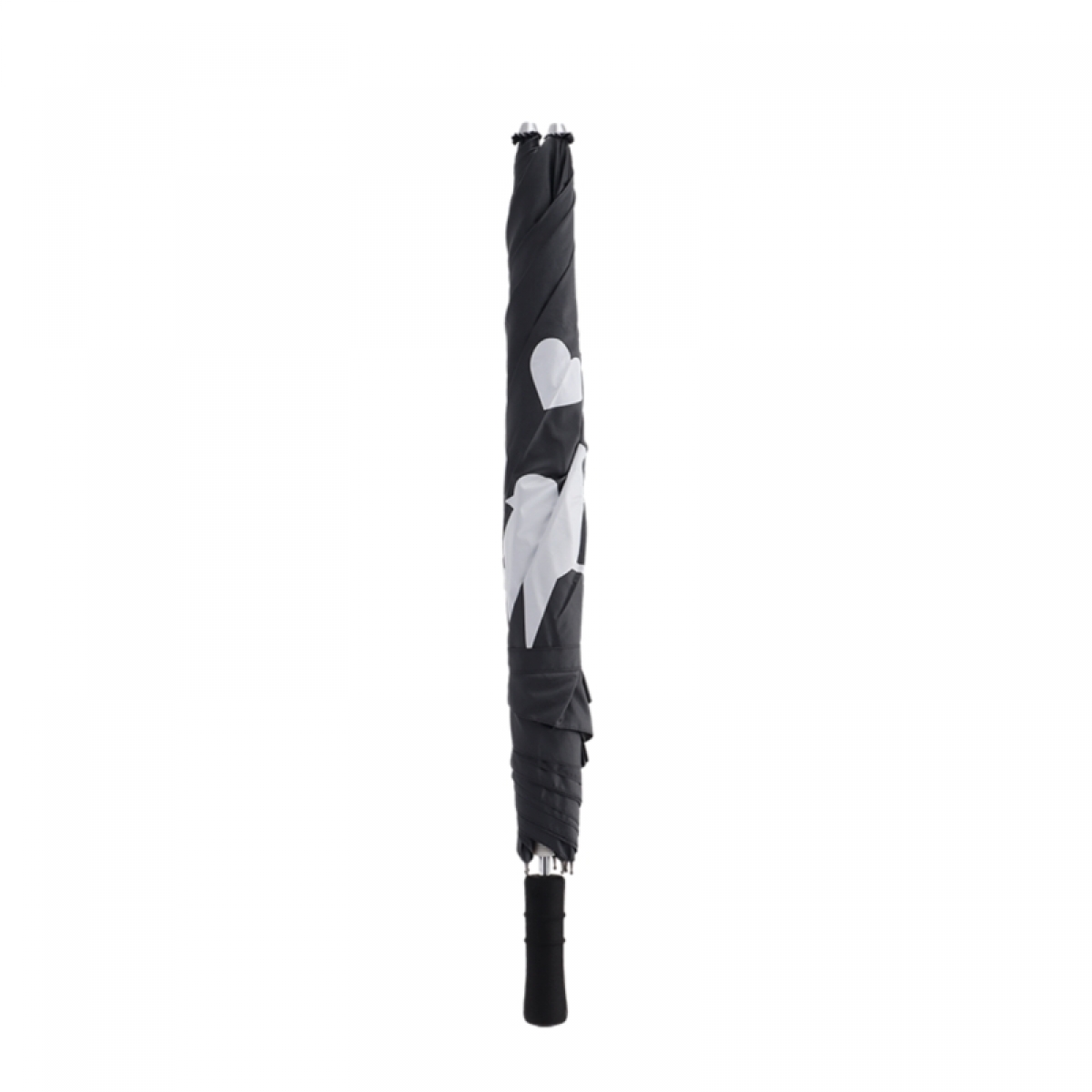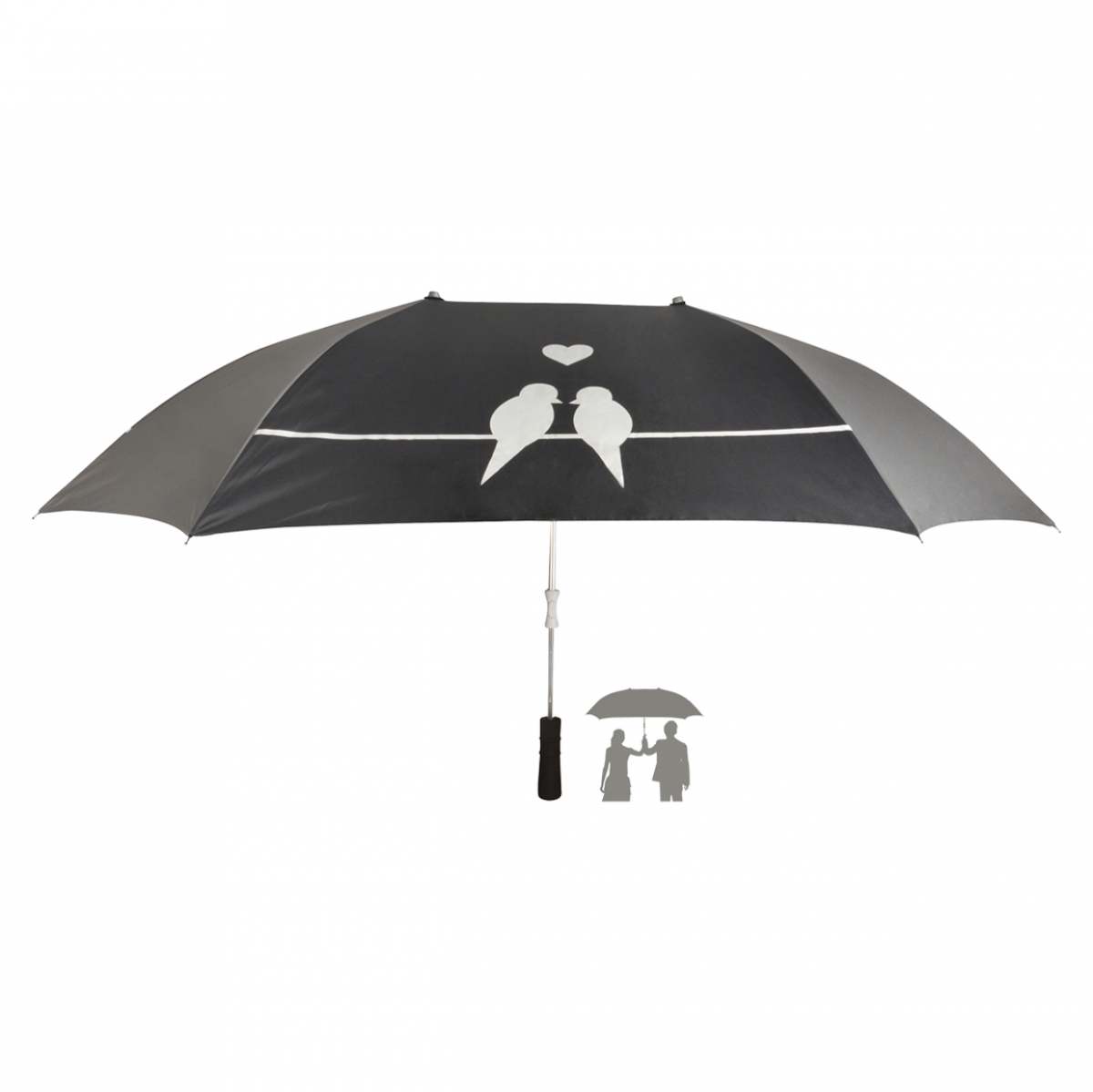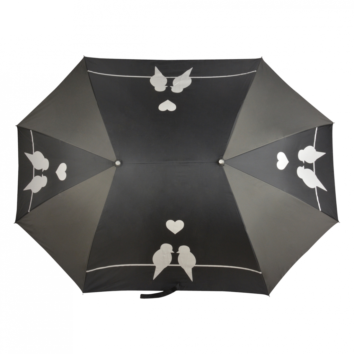 Veľký hodvábny dáždnik s rukoväťou opatrenú plastovým úchopom. Veľký dáždnik pre dve osoby je vyrobený v temne čiernom farebnom spracovanie s detailom bieleho motívu 2 sediacich vtáčikov pod srdiečkom.