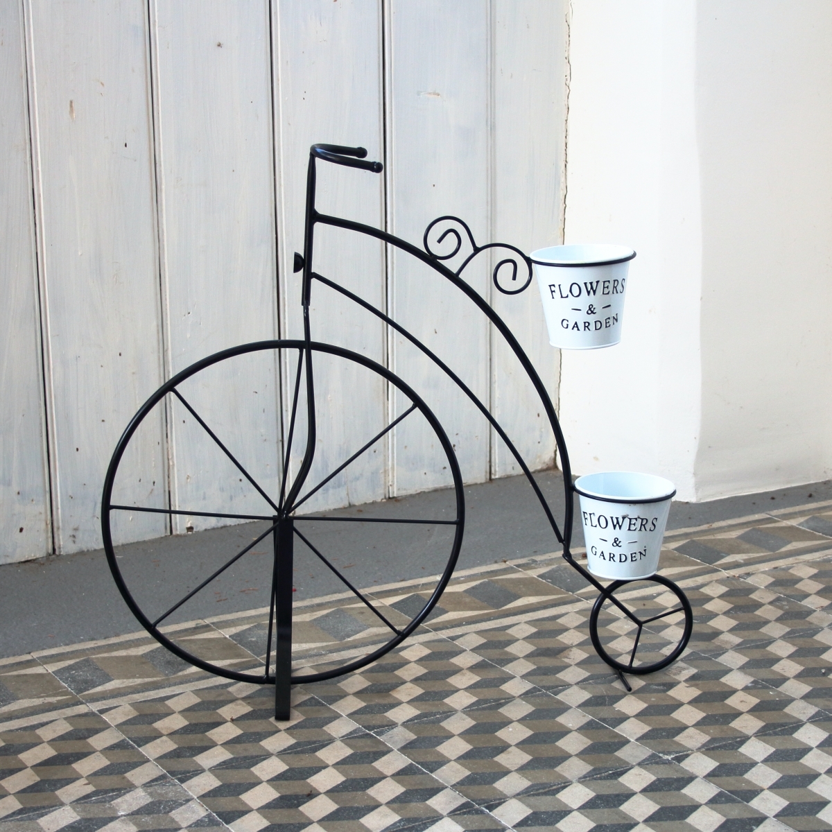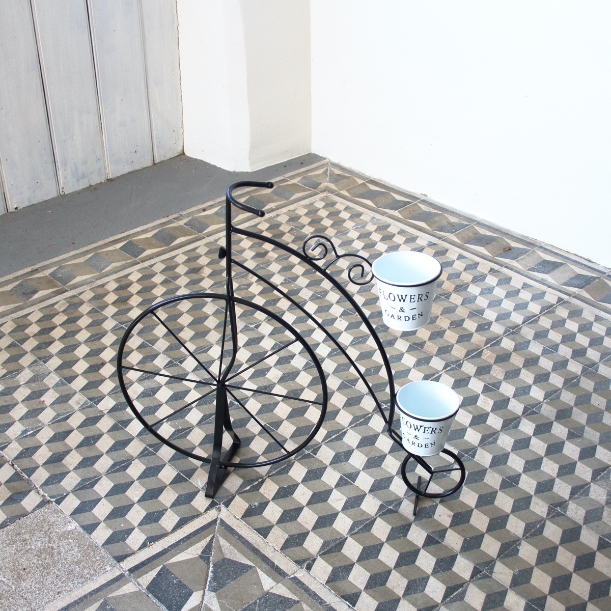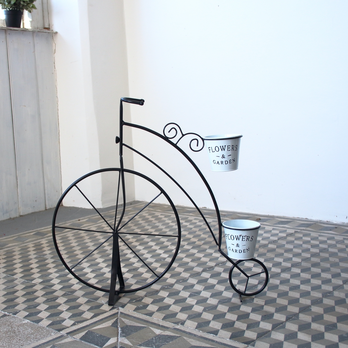 Veľký kvetináč v podobe štýlového kovového kolesá s dvoma menšími hrantíky