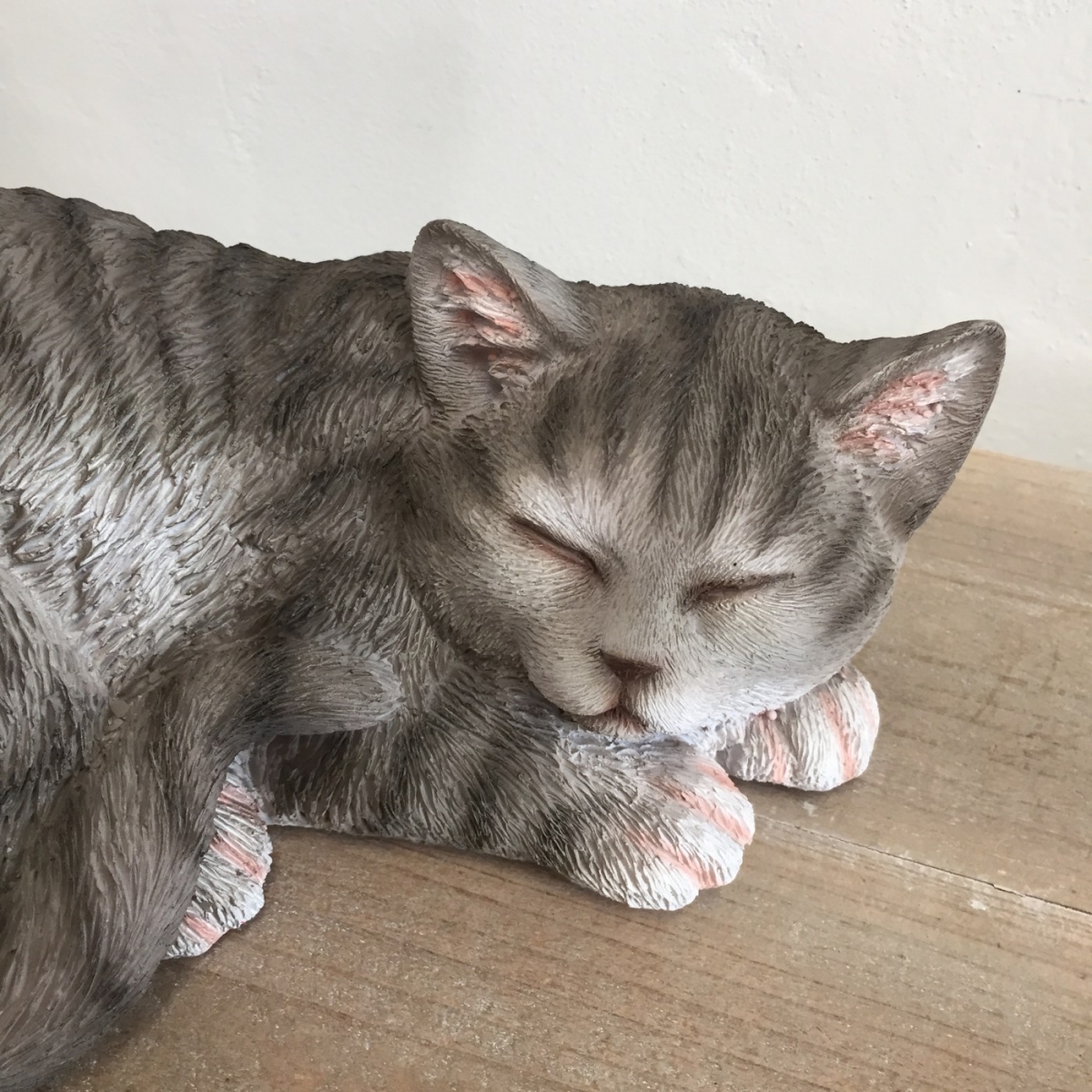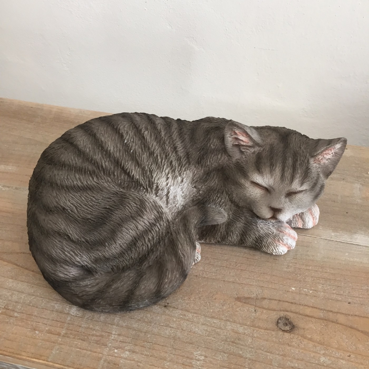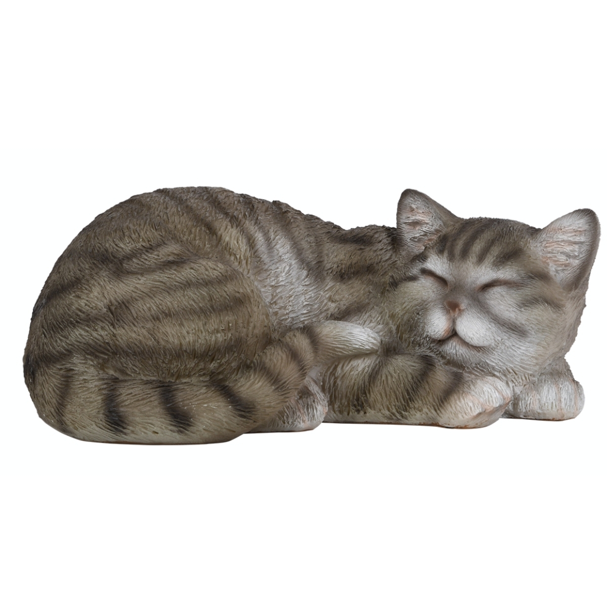 Vonkajšia socha spiacej šedej mačiatko vyrobená z polyresinu je takmer na nerozoznanie od skutočného mačacieho maznáčika.