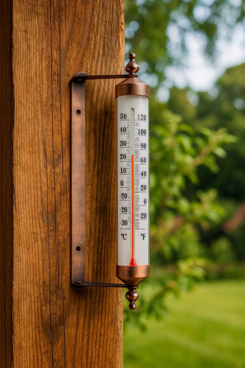 Stupnica na vonkajším teplomere udáva teplotu ako v stupňoch Celzia, tak Fahrenheita. Rozsah stupnice je značný.