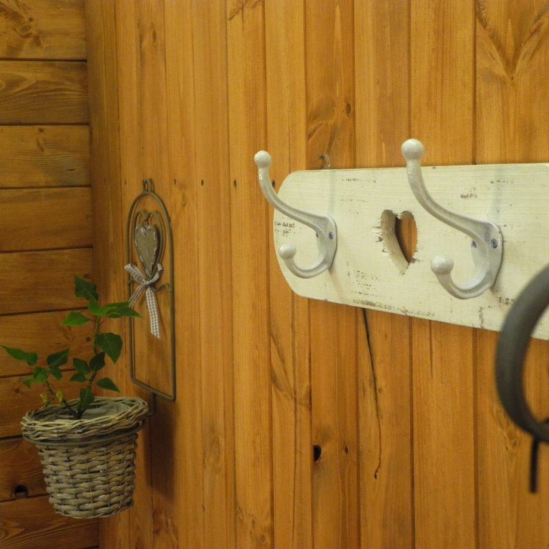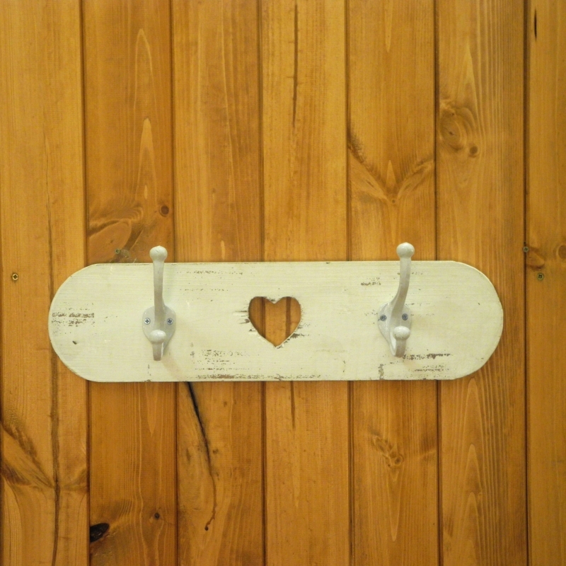 Tento vešiak je opatrený dvoma kovovými háčikmi. Medzi nimi je vyrezávaný motív srdca.