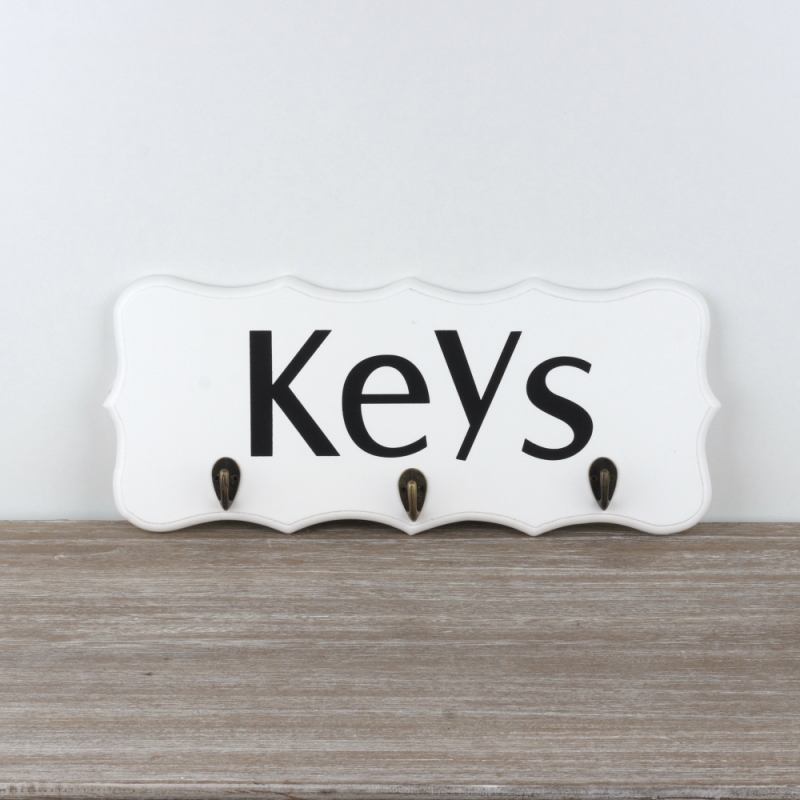 Vešiak má bielu farbu a čierny nápise KEYS (kľúče). Pod ním sú umiestnené tri kovové háčiky na kľúče.