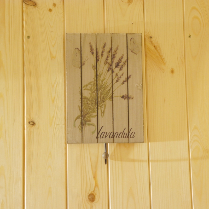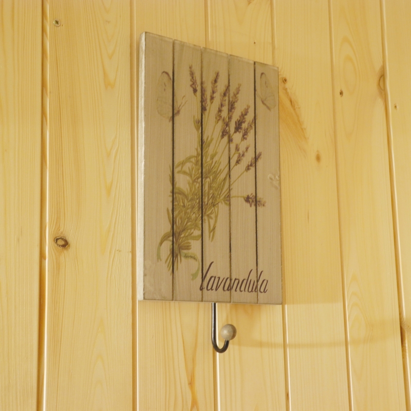 Vešiak si vhodne doplníte rámčekom (dek1655) či schránkou na listy (dek1658) v rovnakom motívu. Všetky uvedené výrobky totiž majú zhodný levanduľový dekor aj drevené prevedenie.
