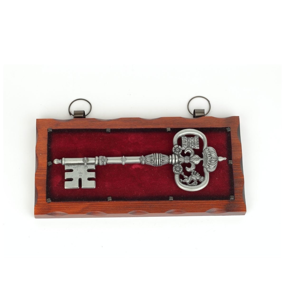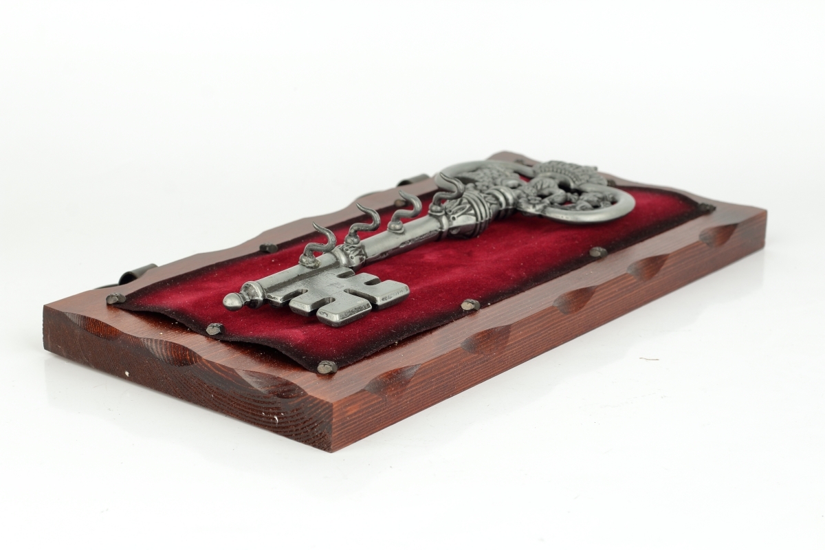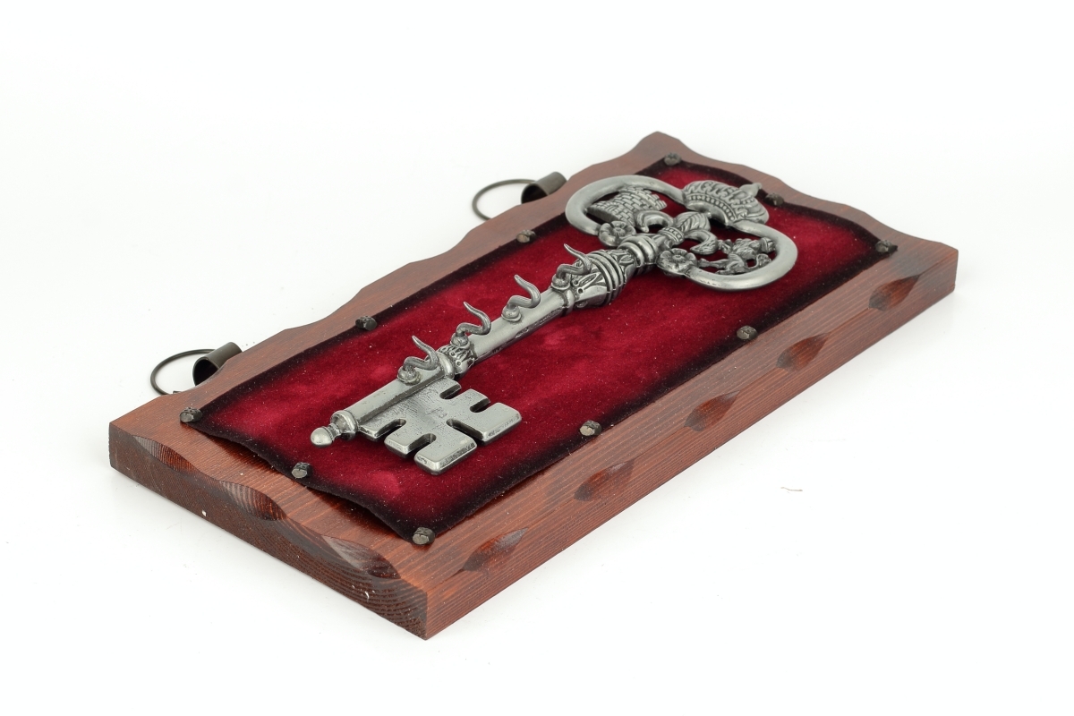 Štýlový vešiak na kľúče, ktorý sa skladá z masívnej drevenej dosky o sile 2 cm, ktorá je potiahnutá vínovo červeným zamatom, a kópie historického kľúča v striebornom prevedení s motívom leva, veže a rastlinných vzorov.